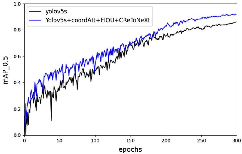 Figure 11. The mAP comparison graph between the CReToNeXt-YOLOv5 model and the YOLOv5 model.
