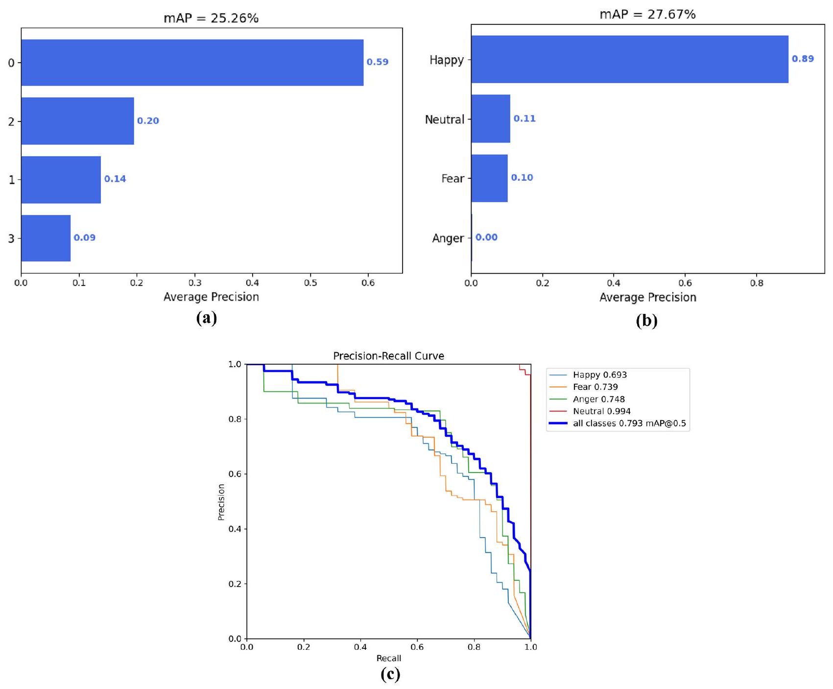 Figure 13. Comparative analysis of mAP for expression recognition: (a) faster R-CNN model, (b) YOLOv4 model, and (c) YOLOv8 model.