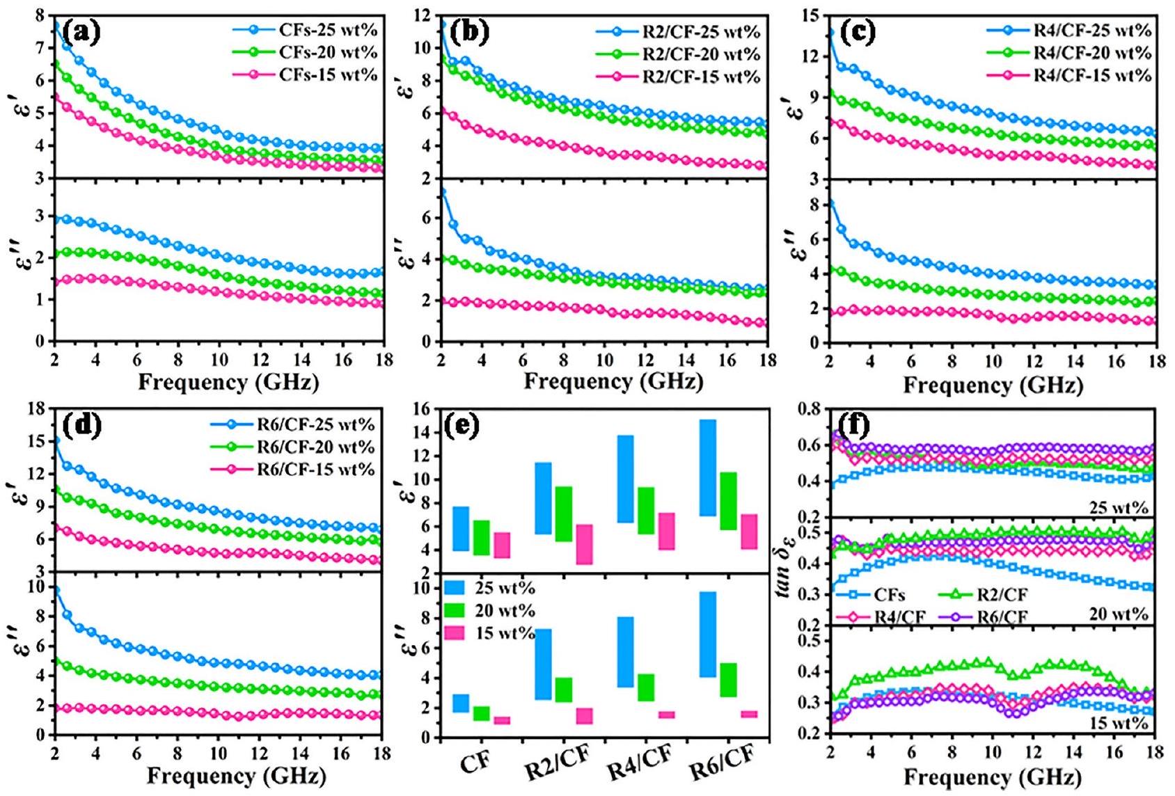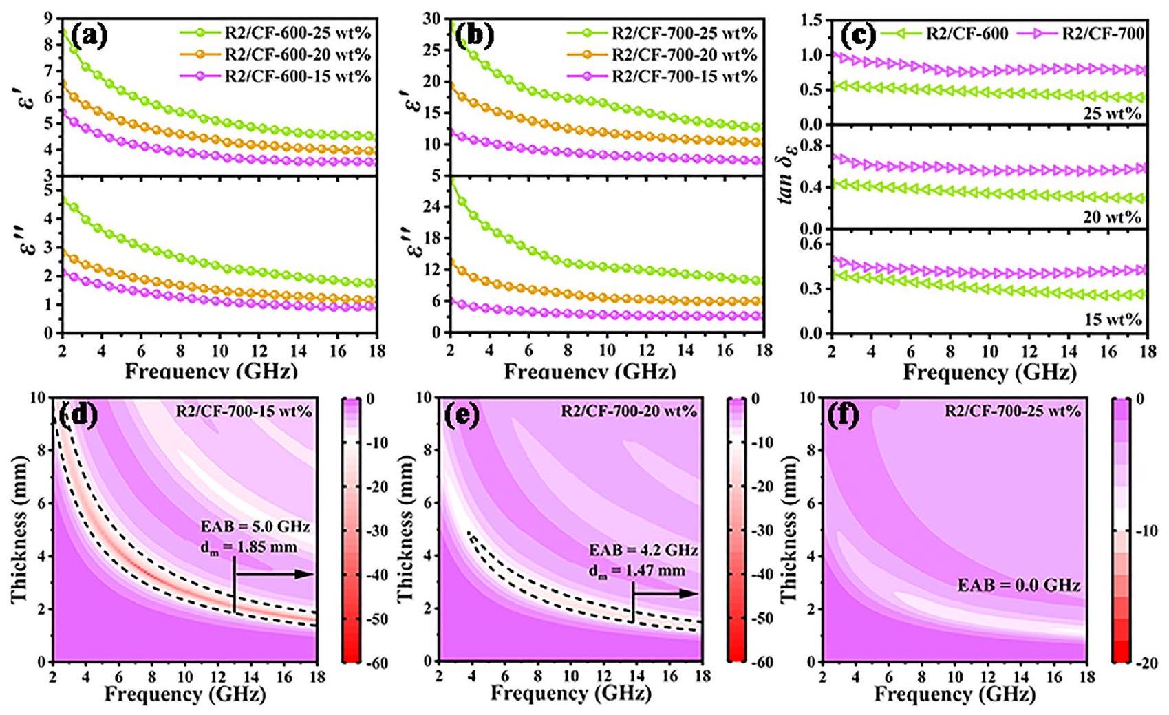 لتأكيد تأثير درجة حرارة الكربنة على أدائها، تم أيضًا دراسة معايير EM لعينات R2/CF-600 و R2/CF-700. كما تقدم عينات R2/CF-600 (الشكل 6أ) و R2/CF-700 (الشكل 6ب) القيم المتزايدة تدريجيًا لـ