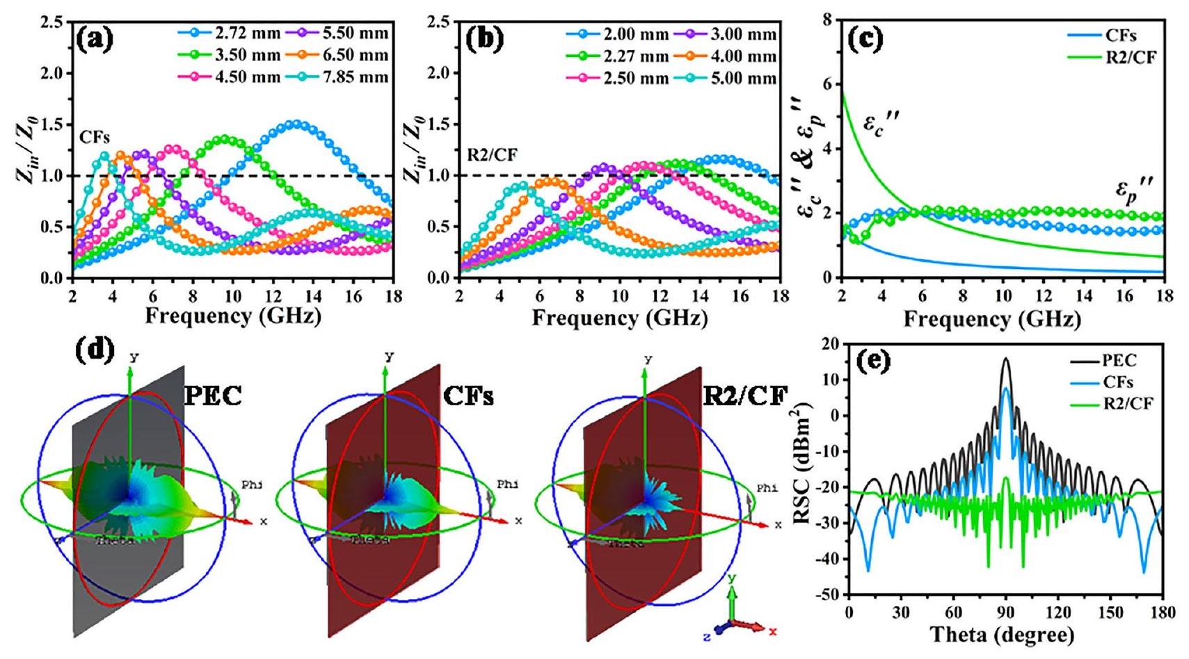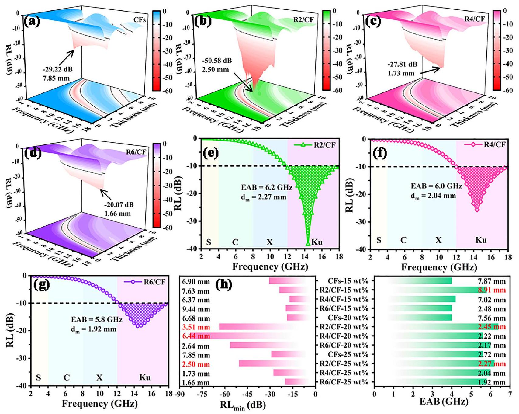 أن معظم طاقة EMW يتم تخفيفها بشكل فعال بواسطة الهياكل غير المتجانسة 2D/3D RGO/CFs. كما هو مقارن في الشكل 7هـ، تعرض عينة R2/CF التي تم الحصول عليها أدنى قيم RCS (أقل من