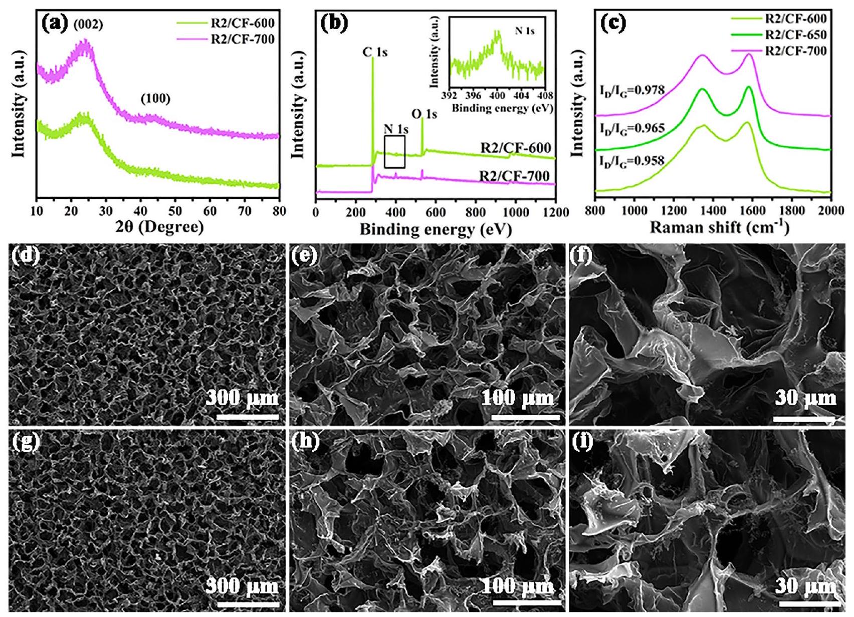 bonds in graphite nanocrystals generate a 2D plane and thus decrease the electrical resistivity [47]. One can see that the Raman spectra are accorded with the above-mentioned XRD and XPS outcomes. Same to R2/CF, the SEM investigations reveal that both the obtained R2/CF-600 (Fig. 5d-f) and R2/ CF-700 (Fig. 5g-i) display the representative 2D/3D vdWs heterostructures in which 2D RGO nanosheets firm anchoring to 3D cellular structure, which implies that the influence of heat treatment temperature on the morphology can be ignored. In short, the content of graphitic carbon is modulated by regulating the heat treatment temperature, facilitating the optimization of their EM parameters and EMW absorption properties.