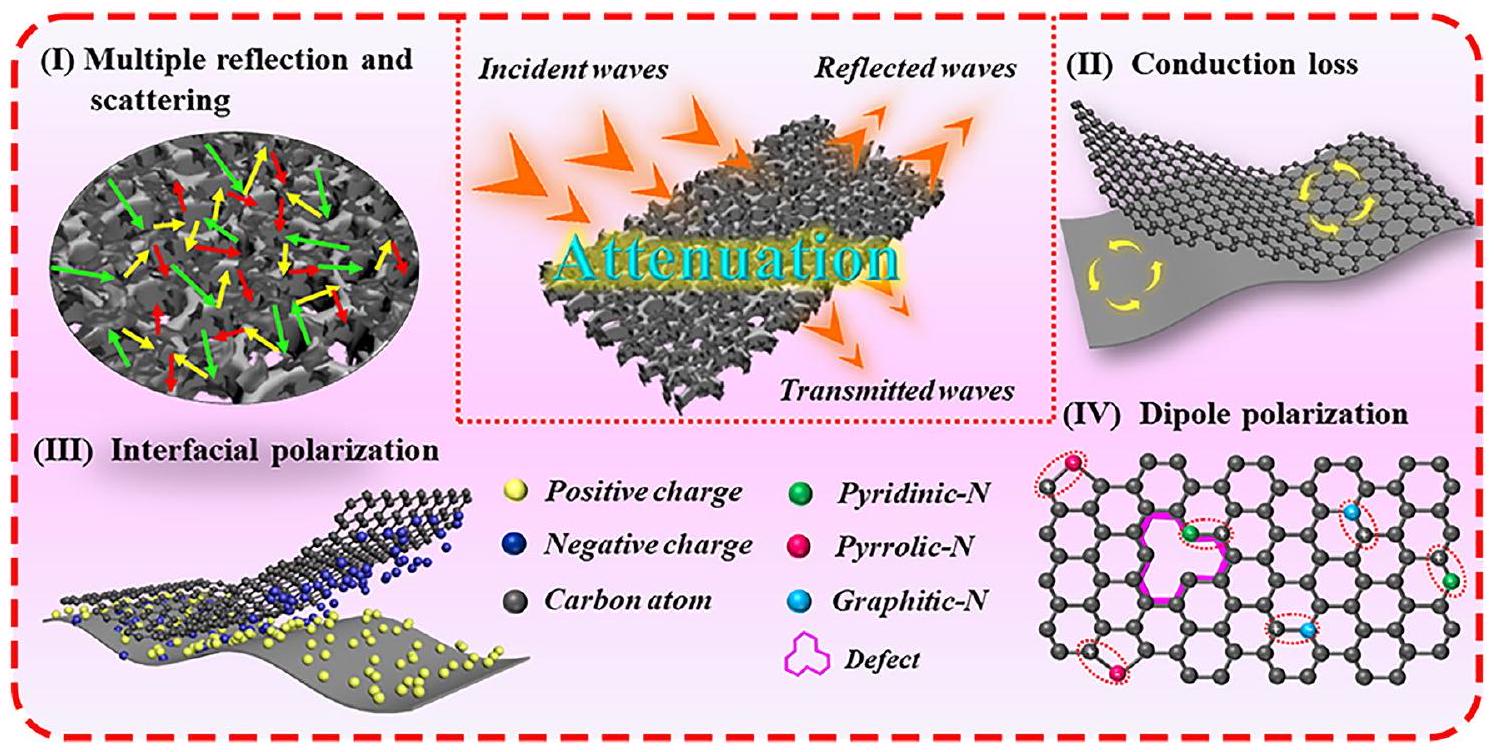 المواد غير المتبلورة النقية والمعدنية العارية، أظهرت المركبات المصممة عرض نطاق امتصاص فعال (EAB)، والذي تم نسبه إلى الواجهة غير المتجانسة التي توفرها الهياكل الطورية المختلفة. وبالمثل، نجح رضا بيمانفار وفريق زانغ في تعزيز أداء امتصاص الموجات الكهرومغناطيسية.