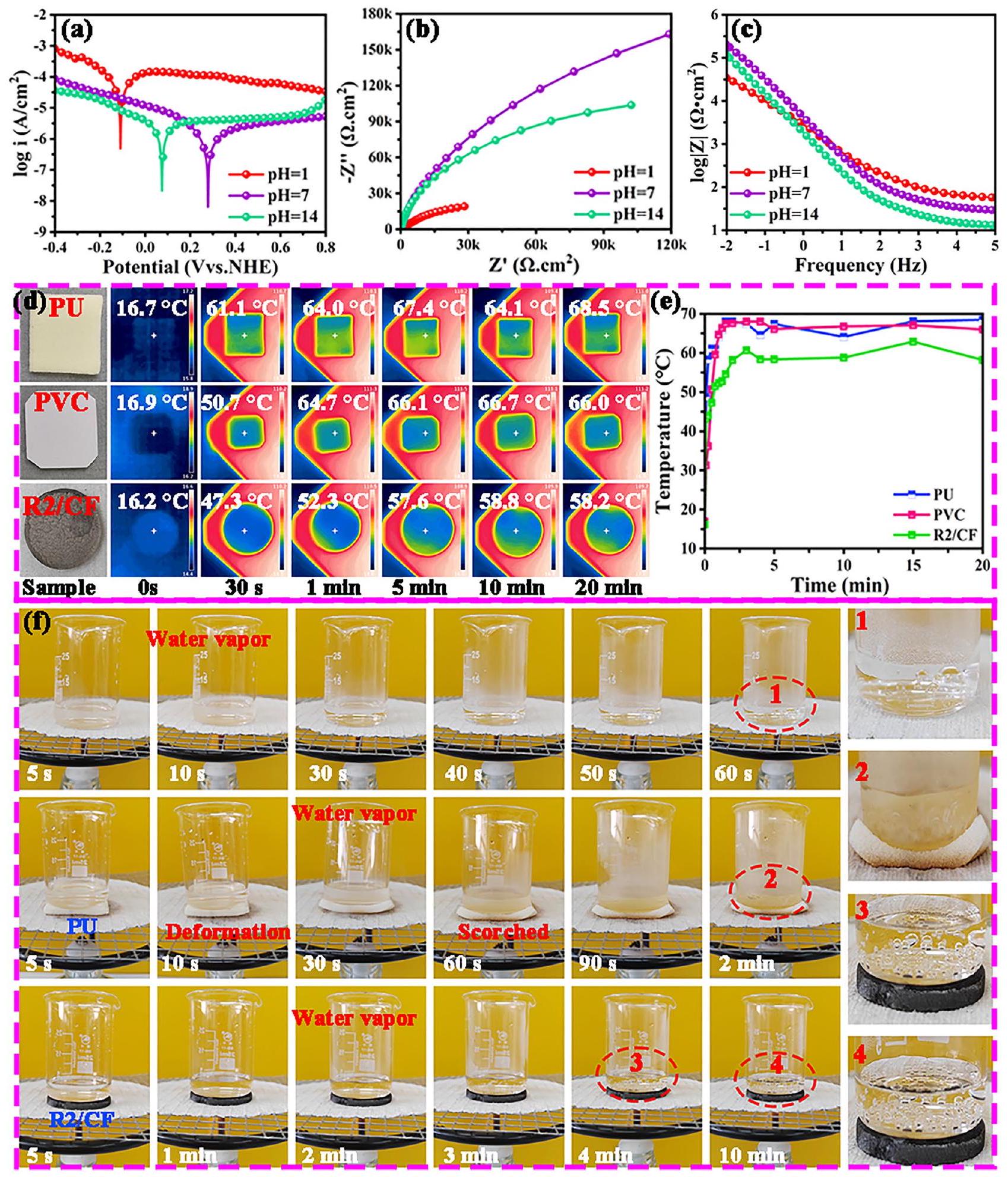 neutral and alkaline condition. Based on the above findings, the outstanding anti-corrosion performance should be attributed to the high physical/chemical stability of carbon materials, dense heterostructures and excellent hydrophobicity. And strong hydrophobicity of R2/CF (water contact angle up to ca.