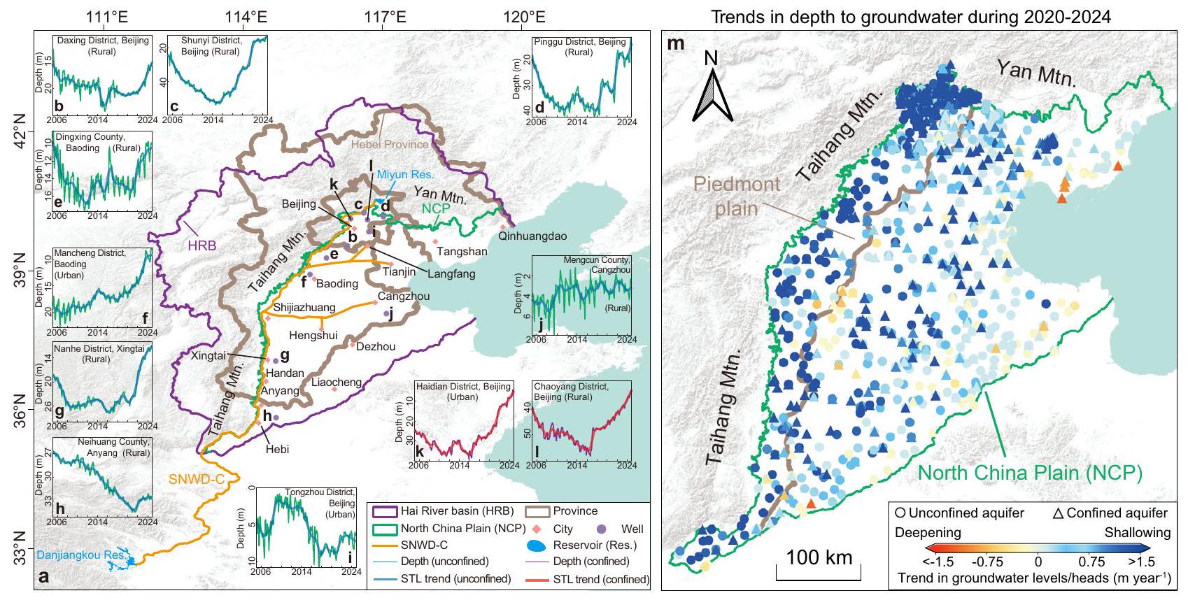 To investigate groundwater recovery in the NCP, we compiled an extensive dataset of in-situ groundwater level measurements from both unconfined and confined aquifers in urban and rural areas within the NCP. The establishment of China’s national groundwater monitoring project in 2018 markedly improved the spatiotemporal coverage and quality of in situ measurements. Prior to 2018, there were many temporal discontinuities in the monitoring data, but the advent of an automatic monitoring system thereafter provided continuous data. Post-2018, there was a notable increase in monitoring well density in the NCP, particularly in the southeastern portions and in confined aquifers (Supplementary Fig. 1). For unconfined aquifers, groundwater levels were deepest ( ) in the piedmont plain in the western portion of the NCP and shallowest ( ) in the eastern portion of the NCP (Supplementary Fig. 1a-d). For confined aquifers, groundwater heads were deepest ( ) in the cities of Tianjin, Cangzhou, and Hengshui (Supplementary Fig. 1e-h). Rapid shallowing trends have been observed across the NCP in both unconfined and confined aquifers (Fig. 2). We calculated Theil-Sen slopes for depth to groundwater at monitoring wells during 2020-2024 (Fig. 2m) because