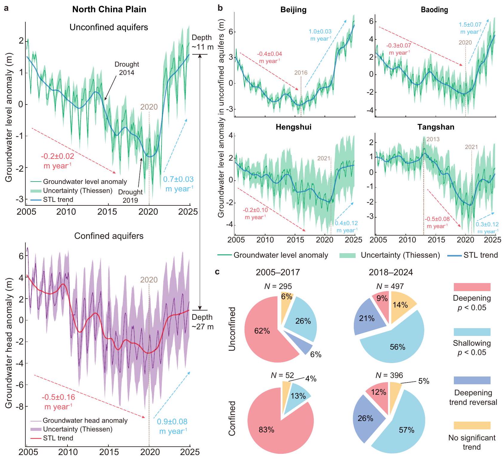 0.7 m year occurred during 2020-2024, with the average groundwater depth anomaly in unconfined aquifers in 2024 nearing levels last seen in 2005. For confined aquifers, we found a deepening trend of year during 2005-2019, followed by a recovery of during 2020-2024. By 2024, the average groundwater head had returned to levels comparable to those in 2013. Notably, the recovery rates for both unconfined and confined aquifers decreased after 2021. Additionally, numerous sources have indicated a recovery in groundwater levels, as shown by the mitigation of land subsidence and re-emergence of springs in regions such as Beijing and Xingtai (see Methods).
