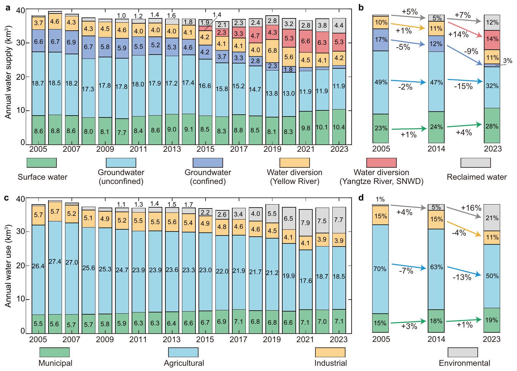 Despite generally stable total water use, a shift towards increased allocation to environmental flows has led to a reduction in total municipal, agricultural, and industrial use, from in 2005 to in 2023 (Fig. 4c, d). Agricultural water use, which accounted for of the total in 2005, has steadily declined to by 2023. In addition to a decrease in cropland area (Supplementary Fig. 2), this reduction is attributed to policies aimed at mitigating water shortages and curbing groundwater extraction, including adjustments to cultivation practices, dryland farming, seasonal fallow, and use of plastic mulch to conserve soil moisture . Municipal water use increased by during 2005-2023, driven by population growth, while industrial water use decreased by a similar percentage due to conservation efforts . Environmental water use, which includes watering trees and grasslands as well as replenishing lakes and rivers , has been over since 2021, becoming the second-largest water use