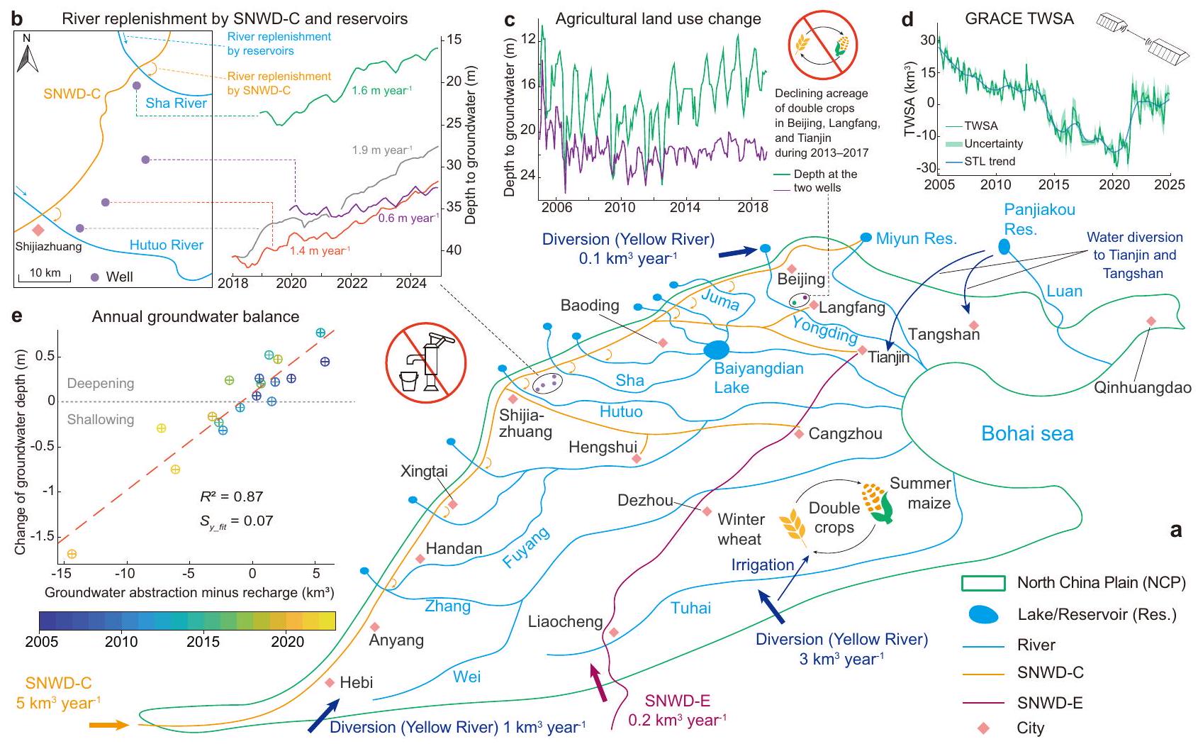 تم تحديد منطقة NCP، التي تشكل الجزء السهل من حوض نهر هاي (HRB)، كنقطة ساخنة عالمية لنضوب المياه الجوفية.. هذه المنطقة، التي تتحمل مسؤولية إنتاج الحبوب في الصين، يدعم سكانًا منمليون شخص وتتميز بموارد مائية محدودة بشدة، معمن الموارد المائية المتجددة المتاحة للفرد سنويًالتلبية المطالب المتزايدة للتنمية الاجتماعية والاقتصادية، تم استغلال المياه الجوفية في منطقة NCP بشكل كبير. بحلول أوائل العقد الأول من القرن الحادي والعشرين، كانت المياه الجوفية تشكلمن إجمالي إمدادات المياه، حيث تمثل الريمن إجمالي استخدام المياه. ونتيجة لذلك، انخفضت مستويات المياه الجوفية في منطقة NCP بمعدلسنةبنهاية القرن العشرين، مما يؤدي إلى تقدير استنفاد تراكمي قدرهمن الستينيات إلىاستجابةً لنقص المياه الحاد في شمال الصين، تم بدء مشروع تحويل المياه من الجنوب إلى الشمال (SNWD) في عام 2002، حيث يتم تحويل المياه من حوض نهر اليانغتسي الرطب. وقد تم استخدام المياه المحولة عالية الجودة بشكل أساسي لتعويض ضخ المياه الجوفية لأغراض بلدية وصناعية.. بالإضافة إلى ذلك، تم استخدام المياه الزائدة الموجهة لتجديد الأنهار والبحيرات وزيادة تخزين المياه الجوفية من خلال إدارة الموارد المائية. إلى جانب السياسات الصارمة لضخ المياه الجوفية (مثل إيقاف الآبار وتقييد ضخ المياه الجوفية للري عندما تكون المياه السطحية متاحة)، ساهمت هذه التدابير في استقرار واستعادة مستويات المياه الجوفية محليًا في منطقة NCP.. بينما أظهرت النماذج المفاهيمية والعددية إمكانية استعادة المياه الجوفية عبر منطقة NCPالمدى الفعلي لهذا لقد ظلت عملية التعافي غير مؤكدة بسبب نقص الملاحظات في الموقع، والتي غالبًا ما تعيقها التناقضات المكانية والزمانية بين سجلات آبار المراقبة.