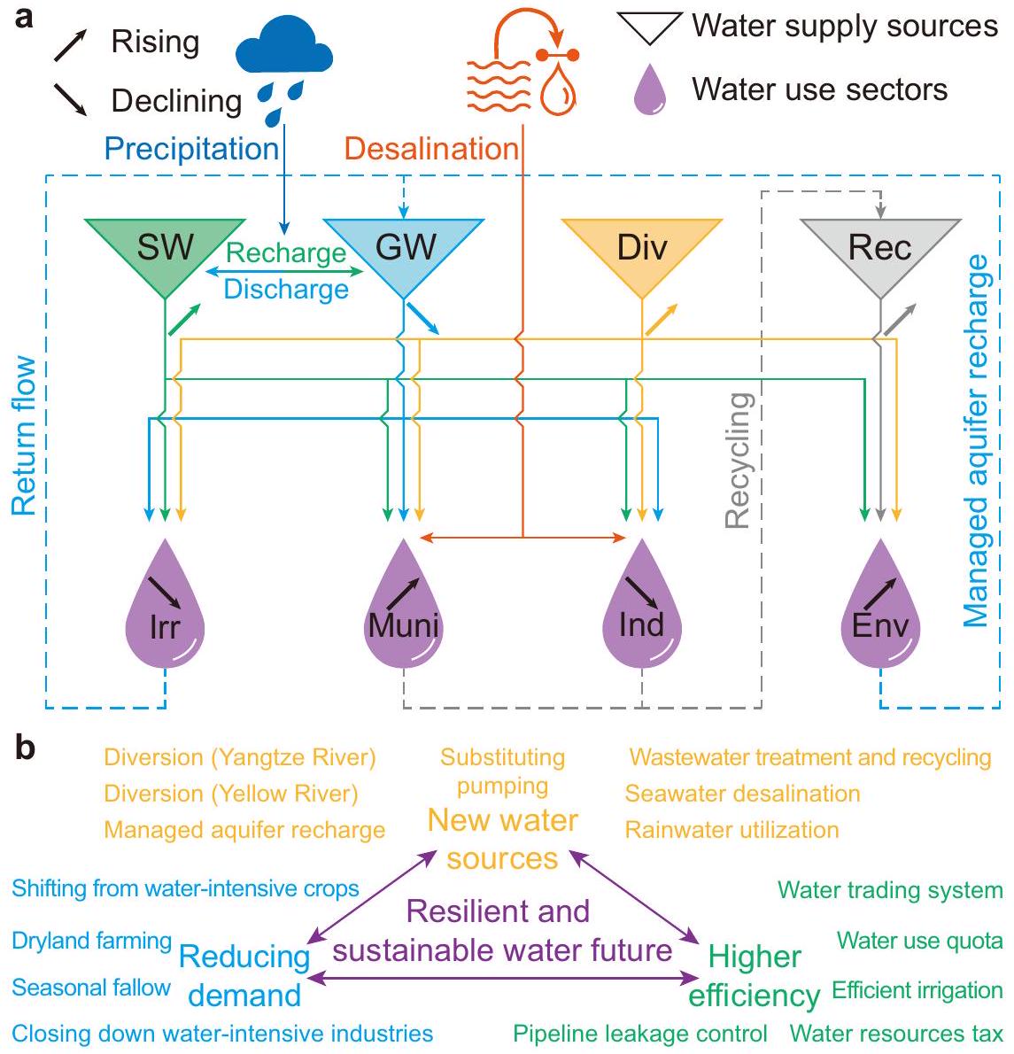 water sources and water use sectors, while dashed lines represent potential ways for used water to be returned as resources. Arrows depict rising and declining trends over the past two decades. b Policy and engineering approaches applied: yellow, blue, and green indicate approaches related to new water sources, reducing water demand, and improving water use efficiency, respectively.