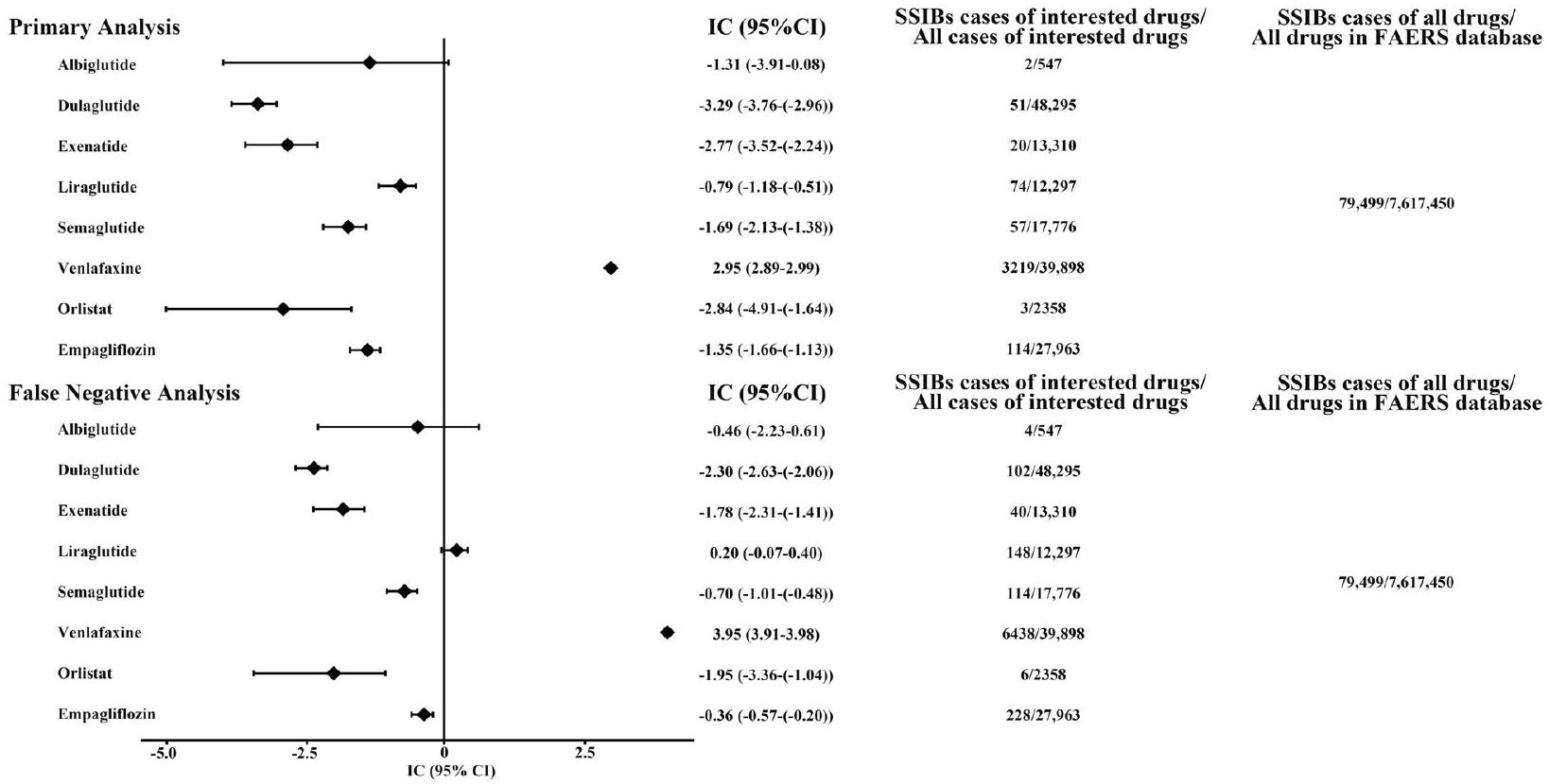 (4) Given the inherent heterogeneity and potential reporting bias in the FAERS database, we conducted a series of sensitivity analyses. First, we excluded case and non-case reports with gastrointestinal events (all PTs belonged to gastrointestinal disorders in the system organ class) in the dataset. This step aimed to reduce the masking effect of gastrointestinal events to avoid possible competitive bias. Furthermore, the main indications in the included cases were type 2 diabetes mellitus and obesity, which are potential risk factors for SSIBs. Therefore, we narrowed the analysis dataset to subject with type 2 diabetes mellitus or weight loss through the indi_pt field (which represents the indication). Previous studies have shown that restricting the analyzed population can mitigate indication bias [21]. IC