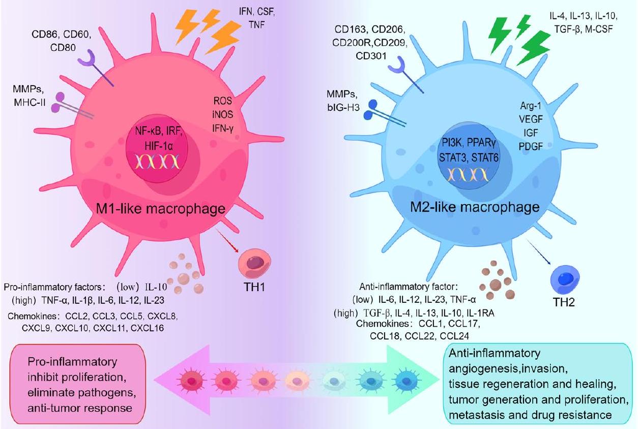 محور الاستقطاب، موضحًا أدوارها الفريدة في البيئة المجهرية للورم. كل من TAMs الشبيهة بـ M1 وTAMs الشبيهة بـ M2 لها علامات سطح خلوية محددة وعوامل وظيفية. تتولى TAMs الشبيهة بـ M1 في البيئة المجهرية للورم أدوارًا في تعزيز الالتهاب، تثبيط التكاثر، القضاء على مسببات الأمراض، والاستجابات المضادة للورم. بينما تشارك TAMs الشبيهة بـ M2 في الأنشطة المضادة للالتهابات، وتعزيز تكوين الأوعية الدموية، وتأثيرها على تجديد الأنسجة والشفاء، وتعزيز توليد الورم، وتكاثره، وانتشاره، ومقاومته للأدوية. (بواسطة Figdraw).