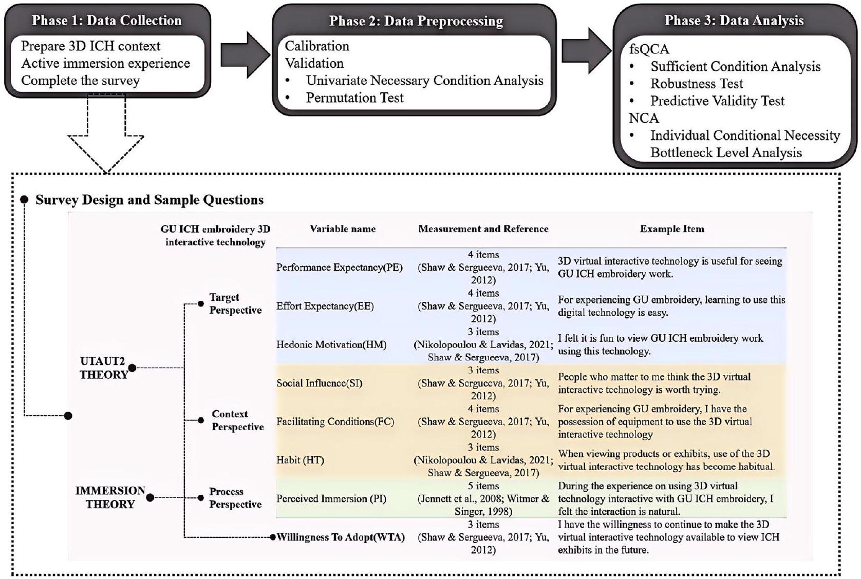 تم إجراء هذه الدراسة على ثلاث خطوات. أولاً، تم بناء إطار نظري متكامل لاستعداد استخدام التراث الثقافي غير المادي الرقمي من خلال دمج UTAUT2 ونظرية الانغماس. ثانيًا، تم استخدام fsQCA وتحليل الشرط الضروري (NCA) لاستكشاف الأسباب المعقدة لاستعداد المستهلكين لاعتماد التراث الثقافي غير المادي الرقمي. أخيرًا، قمنا بتلخيص شروط التجميع التي حفزت استعداد المستهلكين العالي والمنخفض لاعتماد التراث الثقافي غير المادي الرقمي واقترحنا استراتيجيات وممارسات إدارية يمكن أن تعزز استعداد المستهلكين لاعتماد التراث الثقافي غير المادي الرقمي.