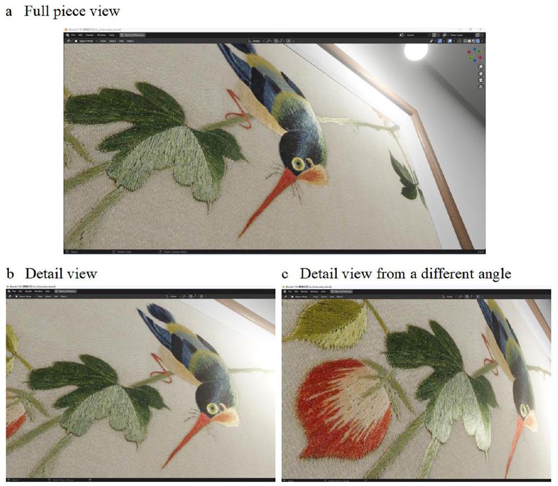 الشكل 3 لقطات شاشة لواجهة عرض تطريز GU ثلاثي الأبعاد. يقدم الشكل لقطات شاشة للواجهة التفاعلية لعرض تصميم تطريز GU ثلاثي الأبعاد من زوايا مختلفة. تعرض (أ) عرضًا كاملاً لقطعة التطريز،