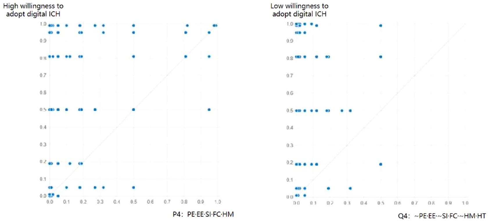 values less than 0.1 , indicating that none of the seven antecedent conditions can individually generate a high willingness to adopt digital ICH. These results were consistent with the single-conditional necessity analysis of fsQCA.