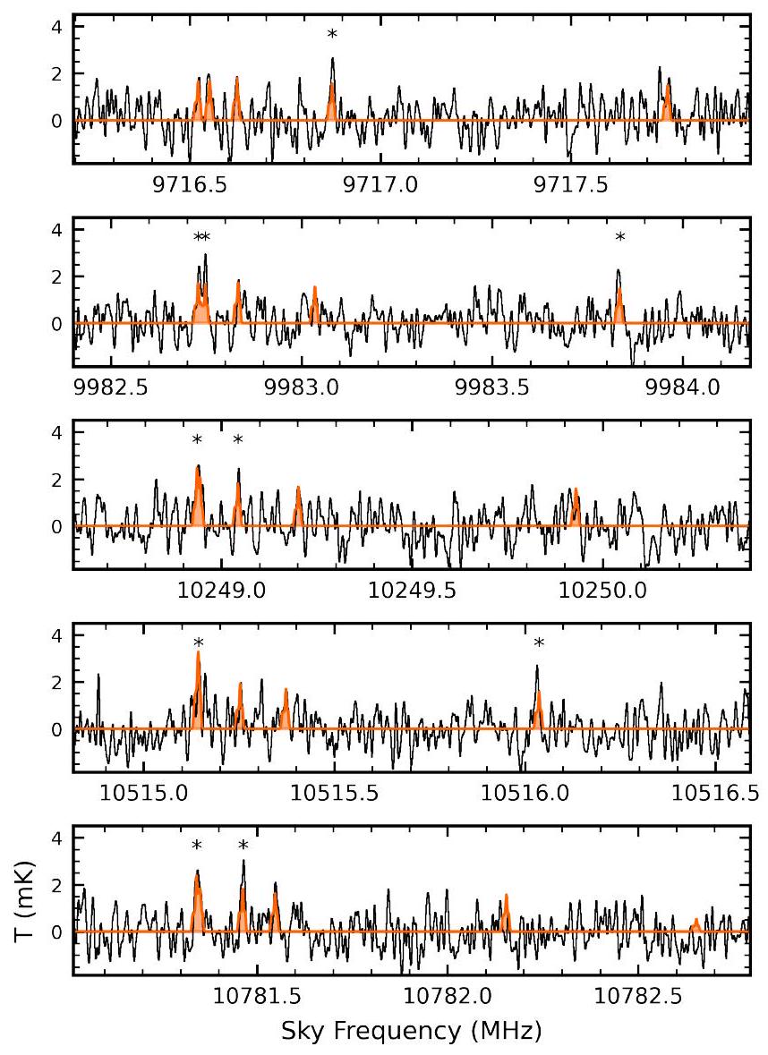https://greenbankobservatory.org/portal/gbt/ gbt-legacy-archive/gotham-data/ Experimental uncertainties are 2 kHz . - *Estimated using the cyanopyrene and cyanocoronene column densities, calculated rate coefficients for CN addition, and an CN/H ratio of 0.15 (see Appendix G and Wenzel et al. 2025).