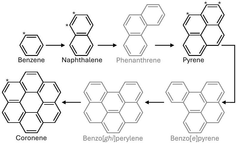 مسار تشكيل الطور لبايرين، بدءًا من الجذري 4-فينانثرينيل. في الواقع، الفينانثرين هو أيضًا عضو في أكثر مسارات بوليمرة PAH استقرارًا من الناحية الديناميكية الحرارية (انظر الشكل 5). ومع ذلك، لم تكن عمليات البحث السريعة عن مشتقه CN- 9-سيانوفيتانثرين، الذي يُعرف طيفه الدوراني (ماكنوتون وآخرون 2018)، ناجحة حتى الآن في ملاحظاتنا باستخدام GOTHAM. قد يكون ذلك بسبب أن الطيفية لواحد فقط من خمسة سيانوفيتانثرين المحتملة…