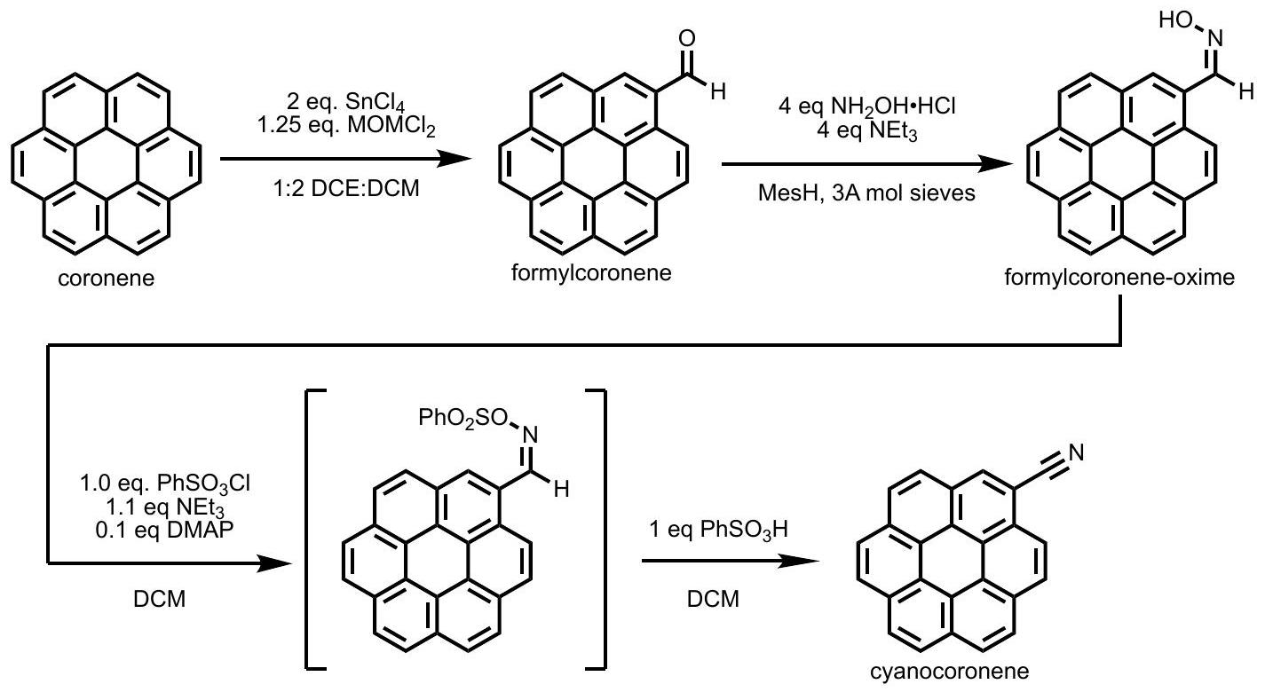 - Direct conversion of formylcoronene to cyanocoronene according to literature protocol (Hyodo et al. 2017) is difficult due to the limited reactivity of formylcoronene at room temperature. Noticeable conversion is only reliably achieved in refluxing toluene, chlorobenzene, or mesitylene. However, the acidic reaction conditions combined with high temperatures frequently resulted in significant degradation of the starting material and severely decreased yields.
