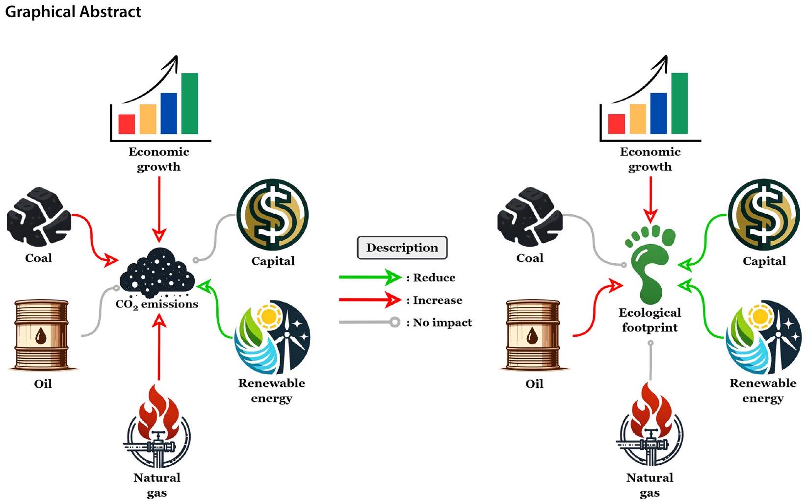 This study investigates the dynamic impact of nonrenewable energy sources (coal, oil, and gas), renewable energy, economic growth, and capital formation on emissions and the ecological footprint in Indonesia from 1965 to 2022. By utilizing FMOLS and DOLS, and conducting a robustness test using CCR techniques, empirical findings indicate that a increase in coal and gas led to a direct increase in emissions by and , respectively, without affecting ecological footprints. Conversely, a 1% increase in oil led to a rise in ecological footprints by , but not in emissions. On the other hand, an increase in renewable energy was associated with reductions in both emissions and ecological footprints by approximately and , respectively, thereby improving Indonesia’s environmental quality. Moreover, an increase in economic growth was linked to increases in both emissions and ecological footprints by approximately and , respectively, while an increase in capital formation resulted in a reduction in the ecological footprint by approximately . The Granger causality test revealed a unidirectional causality from emissions to renewable energy, with bidirectional causality between the ecological footprint and renewable energy.