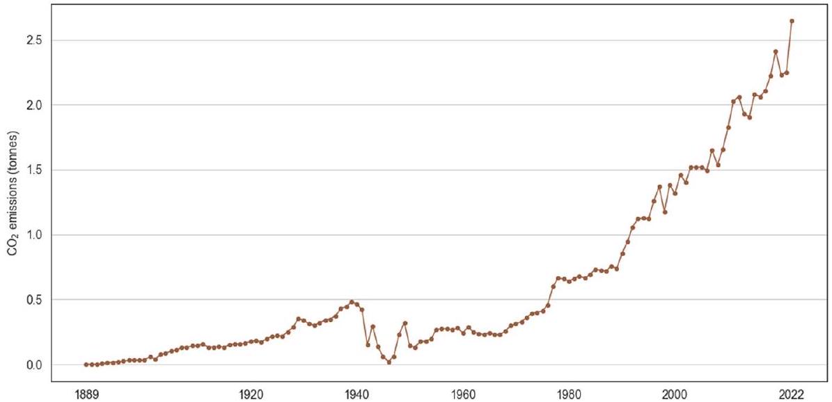 شكل.اتجاه انبعاثات الفرد السنوية بالطن في إندونيسيا. المصدر: عالمنا في البيانات