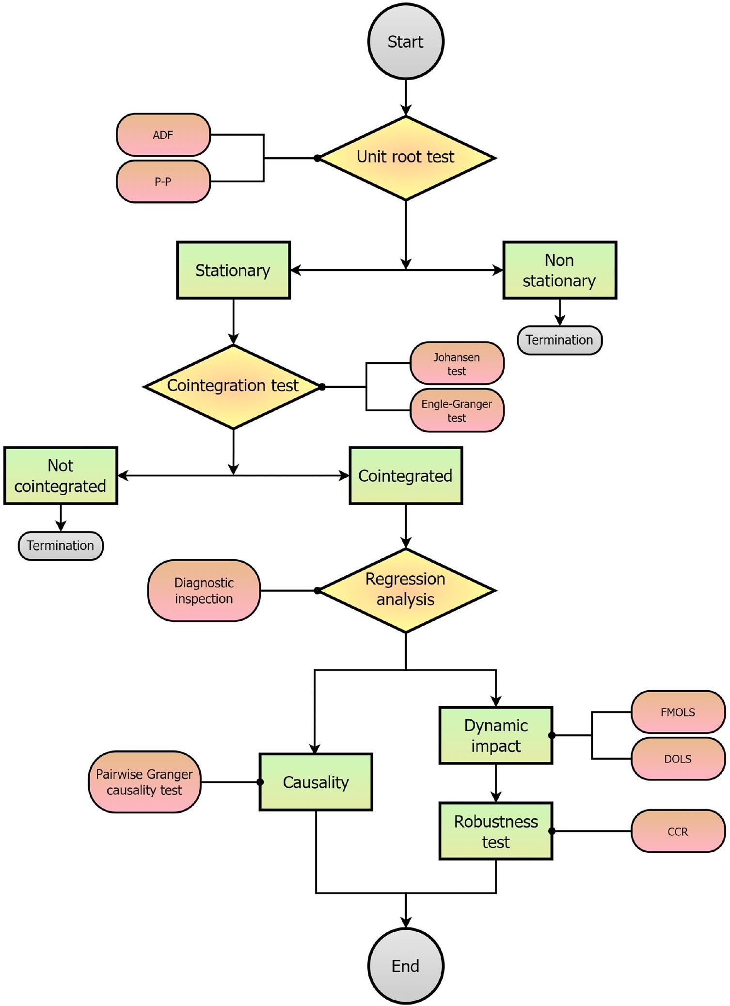 ملخص المنهجية ينص على أن العملية الإحصائية لتحليل بيانات السلاسل الزمنية، كما هو موضح في الشكل 3 (مخطط تدفق التحليل)، بدأت باختبار الجذر الأحادي (ADF و P-P) لتحديد ما إذا كانت البيانات مستقرة. إذا كانت البيانات مستقرة، تم تطبيق اختبار التكامل المشترك (اختبار يوهانسون واختبار إنجل-غرينجر) للتحقق من وجود علاقات توازن طويلة الأجل بين المتغيرات. بالنسبة للبيانات التي وُجد أنها متكاملة، يتبع ذلك تحليل الانحدار باستخدام طرق FMOLS و DOLS، تليها اختبارات القوة مع CCR. علاوة على ذلك، يتم استخدام اختبار السببية (سببية غرانجر الزوجية) لتصوير العلاقات والتفاعلات في تحليلنا. شمل العملية فحصًا تشخيصيًا للتحقق من صحة نموذج الانحدار قبل إنهاء التحليل.