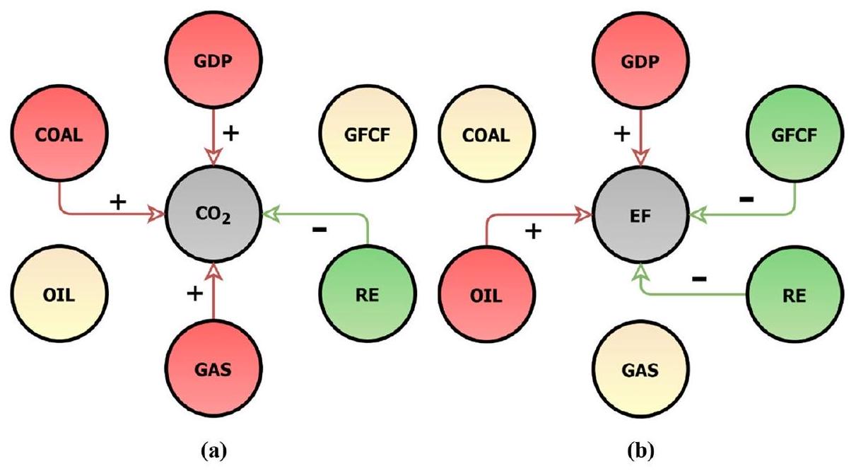 emissions to GFCF and RE, and from GAS to emissions. Additionally, concerning the ecological footprint, the results demonstrate unidirectional Granger causality from EF to OIL, GDP, and GFCF. Furthermore, bidirectional causality was detected between EF and RE .
