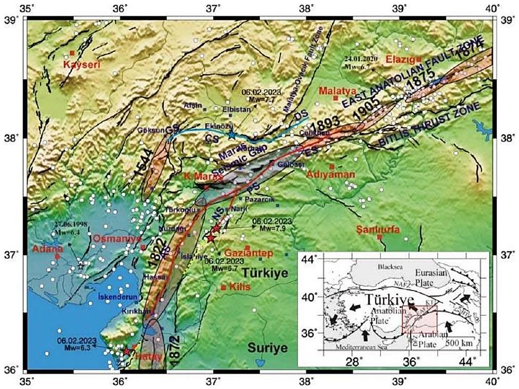 تشمل الزلازل في الشكل 1 الزلازل بعد عام 1970 (دوائر بيضاء)، والزلازل التاريخية المدمرة (إهليلجات مظللة باللون الوردي)، والزلازل الآلية (النجوم البيضاء والحمراء). تشير الأسهم الكبيرة إلى اتجاه حركات الصفائح النسبية (انظر الشكل 1). تم أخذ النشاط الزلزالي من مرصد كانديلي ومعهد أبحاث الزلازل (KOERI) وأمبرسيس (1989). تمزقات السطح لزلازل 2023 في بازرجيك وإلبستان.