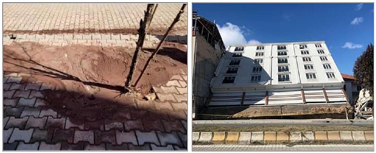 Fig. 8 Sand ejecta (left) and an overturned building (right) in Gölbaşı district of Adıyaman