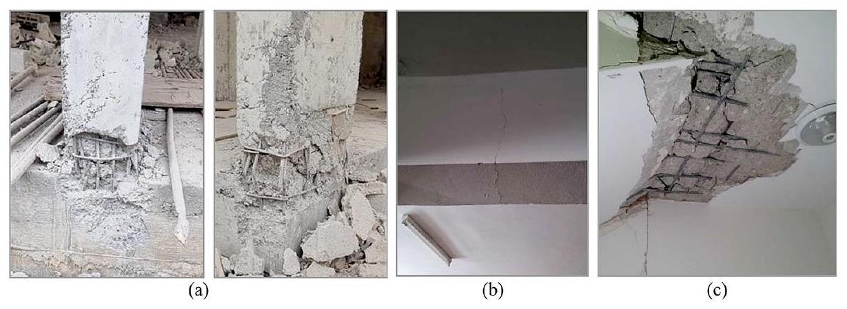 Fig. 9 Examples of plastic hinges at the bottom of columns (a), flexure cracks in beams (b), and damage in stair landings (c)