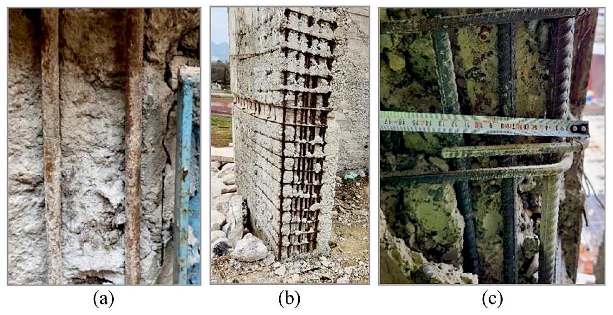 Additionally, it has been observed that plain reinforcing steel was generally used in buildings constructed before 2000. The reinforcement steel also had significant corrosion due to insufficient concrete cover (Fig. 11a). Concrete segregation has also been detected in these buildings (Fig. 11b). In many buildings, stirrups were bent wrongly at 90 -degree instead of 135-degree, as prescribed in the TBEC 2018 (Fig. 11c). In many buildings in the region, it was observed that the protruding reinforcement bars of columns and walls from the foundation did not comply with the overlapping length requirement specified in the regulations. In these areas, due to the lack of proper spacing between reinforcement bars and the bending of reinforcing bars at 90 -degree angles, plastic hinges have formed at the bottom of the columns, causing concrete cracking and reinforcement deformation.