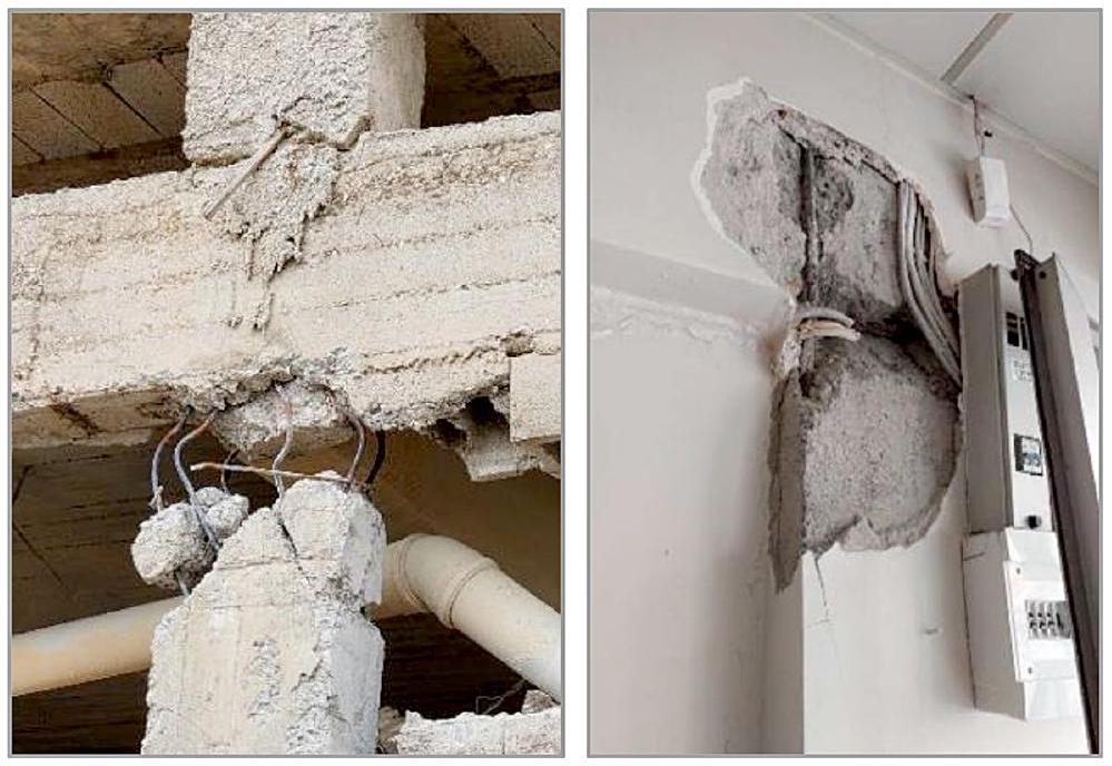 Most buildings constructed before 2000 were built using man-made concrete mixed and manufactured by human labor. Therefore, they have common mistakes such as wrong concrete mix (wrong water, cement, and aggregate ratio), low cement ratio, the existence of organic and inorganic materials in the mix, very small or massive aggregate, wrong placement of concrete (heavy segregation), etc. some examples of poor concrete quality and segregation are depicted in Fig. 10.