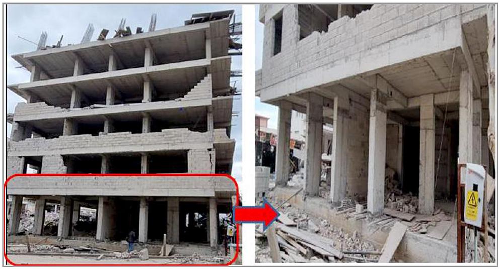 The heavily damaged and collapsed reinforced concrete buildings, which were generally constructed after 2000 years in the densely populated settlements such as Nurdağı, İslahiye, Pazarcık, Türkoğlu, Kırıkhan, and Antakya, are examined closely in the post-earthquake region. Notably, they have similar architectural features and were arranged with the same type of load-bearing system, especially for the floor members. As can be seen from Figs. 12 and 13, the first two floors of such multi-story buildings have been designed for commercial workplace purposes, and the floors above them are used as residential areas with large and heavy overhangs. It has been observed in the field that these types of apartment buildings with similar engineering and architectural design errors failed against seismic forces.