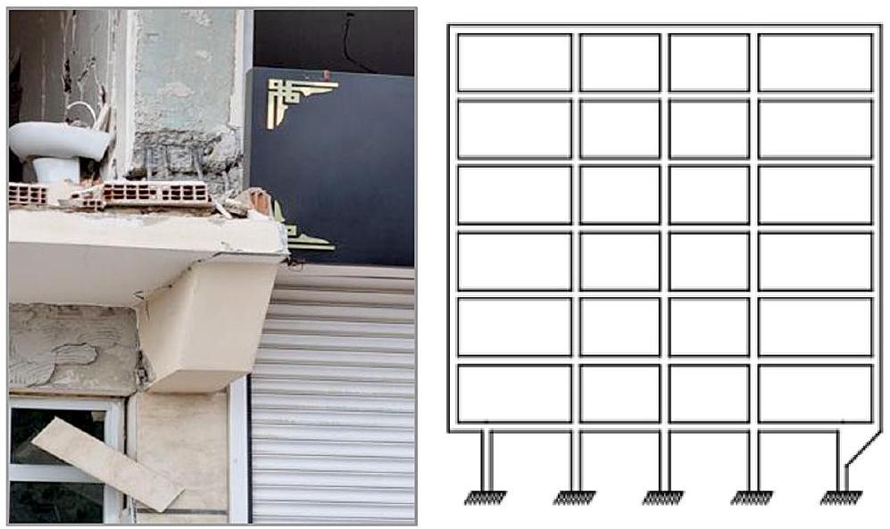 specifically located on main streets had extensive overhangs extending to 1.5 m . Moreover, the columns carrying those overhangs were not connected with the beams, and that caused the formation of an insufficient tied framing system. Therefore, the columns could not work together or provide proper load transfer (Fig. 15). Moreover, in earthquake-resistant building design, placing shear walls that can withstand a significant portion of the earthquake forces is important. In the region, even if shear walls were included in the buildings, it was observed that they were not symmetrically placed in structures. The resulting irregularity in torsion and the additional moment effects caused by the heavy overhangs resulted in the formation of plastic hinges at the end regions of all columns in the outer axis (Fig. 16a).