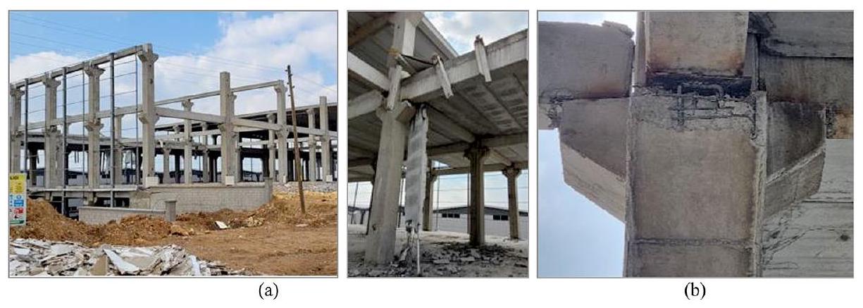 Widespread damage in precast structures was characterized by the detachment of horizontal beams from column corbels, inadequate connections leading to roof purlin collapses, and compromised structural integrity due to poor joint responses and pin connections. Architectural and structural arrangement errors introduced torsional effects, separating beams from columns, while severe damage and collapses were common in structures with weak columns and heavy roof beams. Infill wall issues were also prevalent, attributed to low-strength materials and a lack of horizontal reinforcement. Lastly, column-foundation nodes exhibited various structural problems, including bending cracks, shell concrete separation, reinforcement buckling, and damage to reinforcement integrity.