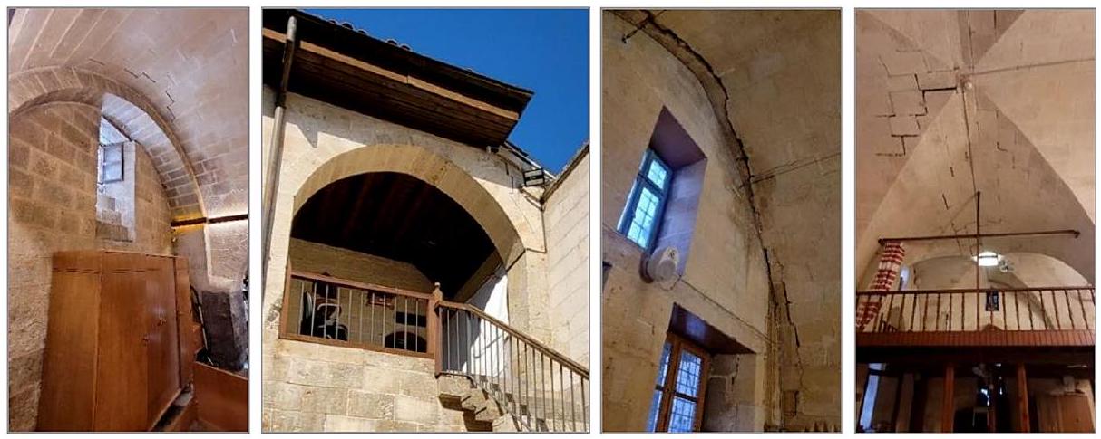 Moreover, the investigated historical buildings in Gaziantep, built mainly between the 17th century and the end of the 19th century, performed better seismic response due to being far from the fault line. Restored historical building examples showing good performance in the historical center of Gaziantep province were examined. Since these structures are relatively far from the fault line, the structures were exited with accelerations smaller than the design earthquake level of TBEC 2018. In the historical buildings inspected in Gaziantep province, slip cracks in the main walls, openings in the joints, and local separations in the outer layers of the walls were observed (see Fig. 25). There was damage to the joints of arches and vaults, and out-of-plane movements were detected at the wall-vault joints (Fig. 26). Opening at the joints, vertical cracks, and overturning on the pedestals were observed in the mosque’s minarets (Fig. 27).