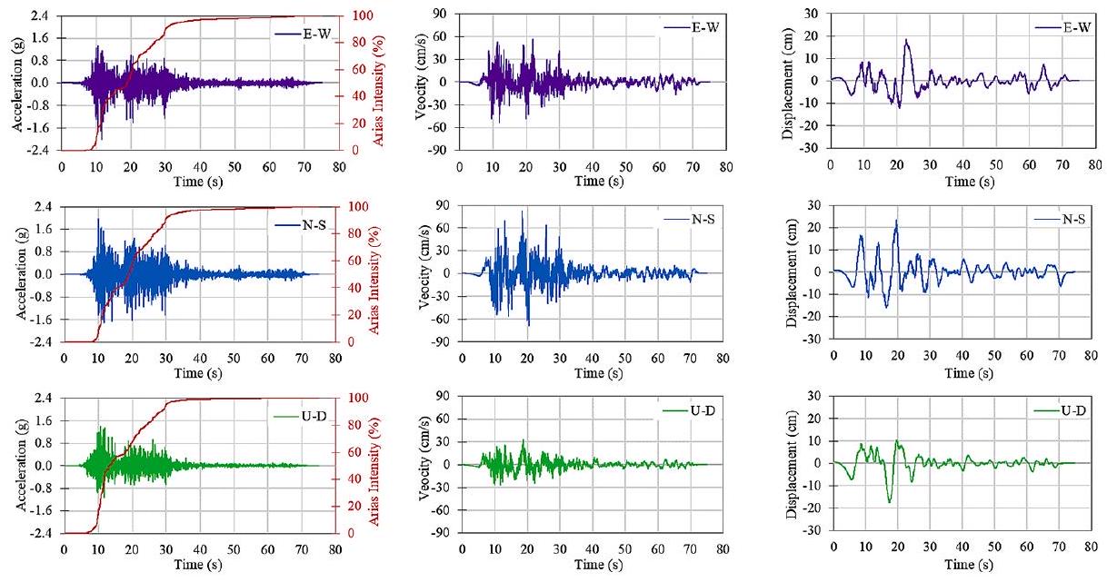 Fig. A2 Elbistan (Kahramanmaraş) Earthquake ( ), Station 4406 (Malatya/Akçadağ), Acceleration vs. Arias Intensity, Velocity and Displacement time histories ( , Soil class: ZB)