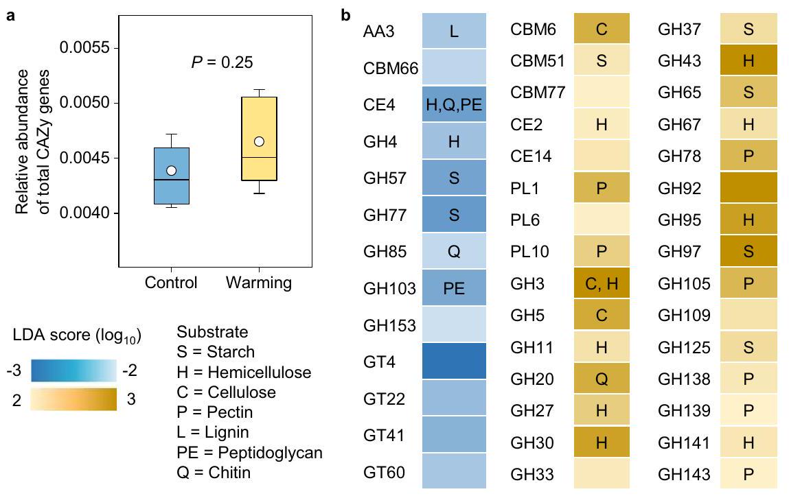 كشفت أن التسخين التجريبي لم يغير التركيب العام لمجتمع الميكروبات، ولكنه قلل من كفاءة استخدام الكربون الميكروبي وشكل شبكة أكثر تعقيدًا، والتي كانت مسؤولة عن الزيادة