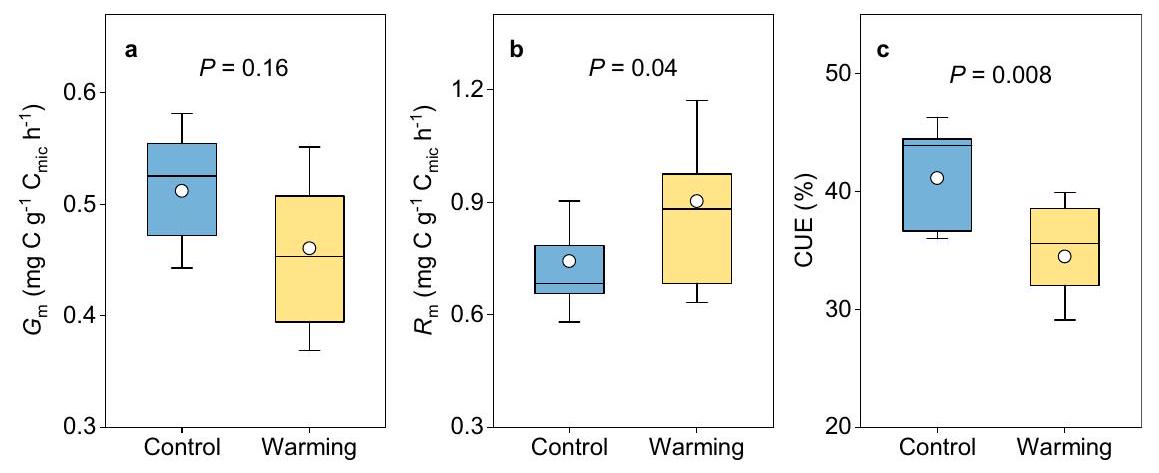 the interquartile range, with blue and yellow indicating control and warming, respectively. Horizontal line and circle within the box show the median and mean value, respectively. The whisker denotes SD (