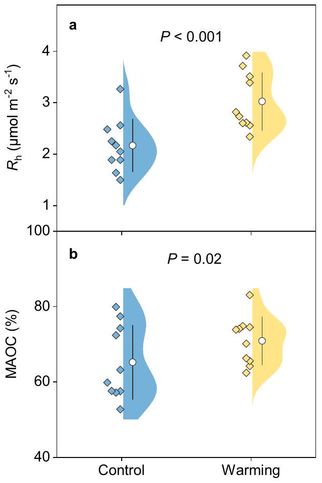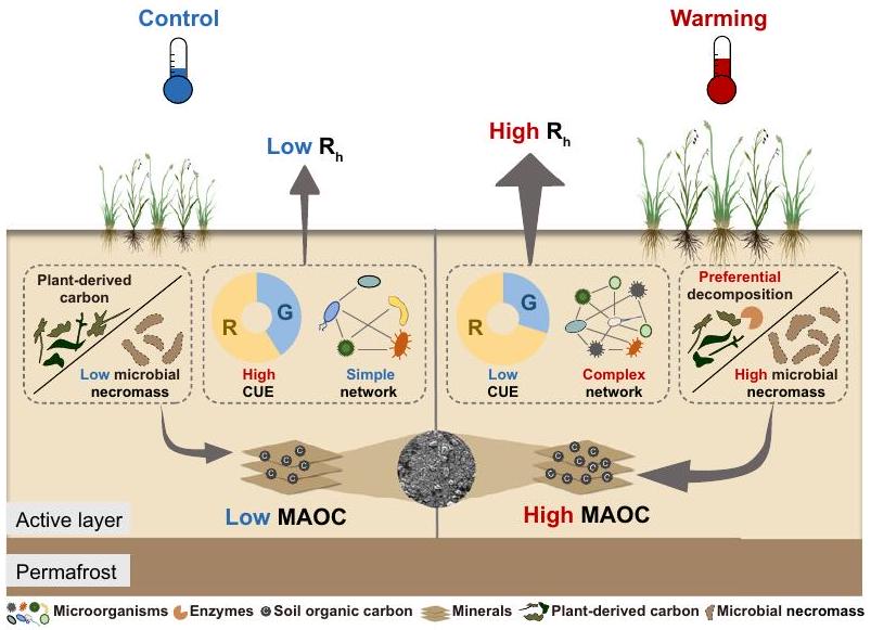 فهم التغيرات في المجتمعات الميكروبية في التربة استجابةً للاحترار المناخي والسيطرة عليها على عمليات الكربون (C) في التربة أمر بالغ الأهمية لتوقع ردود الفعل بين الكربون في التربة والمناخ. ومع ذلك، ركزت الدراسات السابقة بشكل رئيسي على إطلاق الكربون من التربة الذي يتم بوساطة الميكروبات، ولا يُعرف الكثير عن ما إذا كان وكيف يؤثر الاحترار المناخي على الأيض الميكروبي والإدخال اللاحق للكربون في مناطق التربة المتجمدة. هنا، استنادًا إلى تجربة تسخين في الموقع استمرت لأكثر من نصف عقد، نوضح أنه مقارنةً بالتحكم البيئي، يقلل الاحترار بشكل كبير من كفاءة استخدام الكربون من قبل الميكروبات ويعزز تعقيد الشبكة الميكروبية، مما يعزز التنفس غير الذاتي في التربة. في الوقت نفسه، تتراكم الكتلة الميكروبية الميتة بشكل ملحوظ تحت تأثير الاحترار، على الأرجح بسبب التحلل الميكروبي المفضل للكربون المشتق من النباتات، مما يؤدي إلى زيادة الكربون العضوي المرتبط بالمعادن. مجتمعة، تظهر هذه النتائج الأدوار المزدوجة للميكروبات في التأثير على إطلاق الكربون من التربة واستقراره، مما يوحي بأن ردود الفعل بين الكربون في التربة والمناخ ستضعف مع مرور الوقت مع تراجع استجابة التنفس الميكروبي وزيادة نسبة حوض الكربون المستقر.