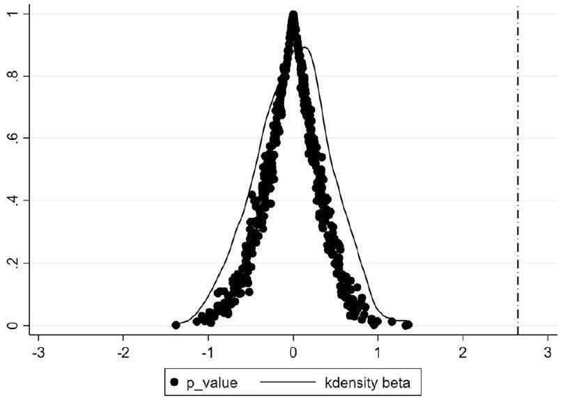 Fig. 2 Placebo test. The figure presents the results of the placebo test. Specifically, a dummy variable for the fake policy IMPP is substituted into the Eq. (9), and the regression process is repeated 500 times. Then, the distribution of the IMPP coefficients for the 500 regressions is shown as the solid line. The horizontal axis represents the estimator, the vertical axis represents the density and p -values, the black dots represent the p -values of the estimator, and the dashed line represents the coefficient in baseline regression. It can be seen that the coefficients of false treatment groups are clustered around zero, significantly deviating from the baseline regression coefficient value of 2.611 , which proves the validity of the benchmark results.