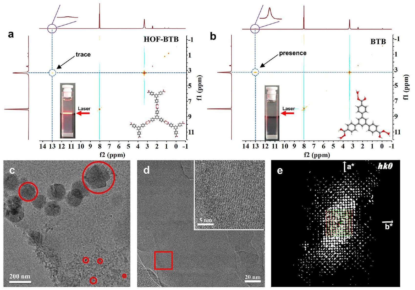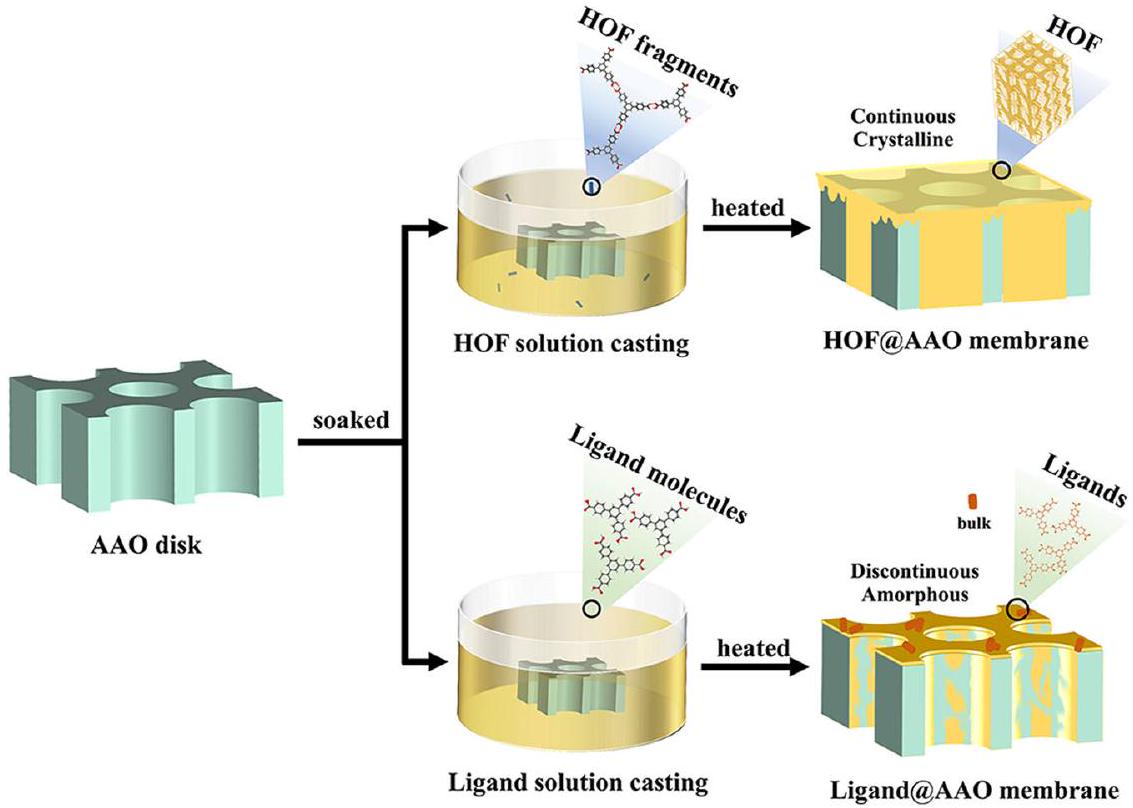 الإطارات العضوية المرتبطة بالهيدروجين (HOFs) هي نوع من المواد المسامية الناشئة. في الوقت الحالي، تم إجراء القليل من الأبحاث حول حالتها في المحلول. تُظهر هذه الدراسة أن HOFs تتفتت إلى جزيئات صغيرة مع الحفاظ على تجميعاتها الأصلية عند تشتتها في المذيبات، كما تم تأكيده بواسطة المجهر الإلكتروني بالتبريد المدمج مع تقنية حيود الإلكترون ثلاثي الأبعاد. تشير تحليلات الرنين المغناطيسي النووي (NMR) من البعد الواحد والبعدين وتحليلات جهد زتا إلى أن محلول الكولود المستند إلى HOF والمحلول الجزيئي المعزول لهما اختلافات كبيرة في التفاعلات بين الجزيئات وسلوك التجميع. تتيح هذه القابلية الفريدة للمعالجة في المحلول تصنيع أغشية HOF مستمرة ومتنوعة ذات بلورية عالية ومسامية من خلال طريقة صب المحلول على ركائز متنوعة. من بينها، تُظهر أغشية HOF-BTB@AAO أداءً عاليًا.