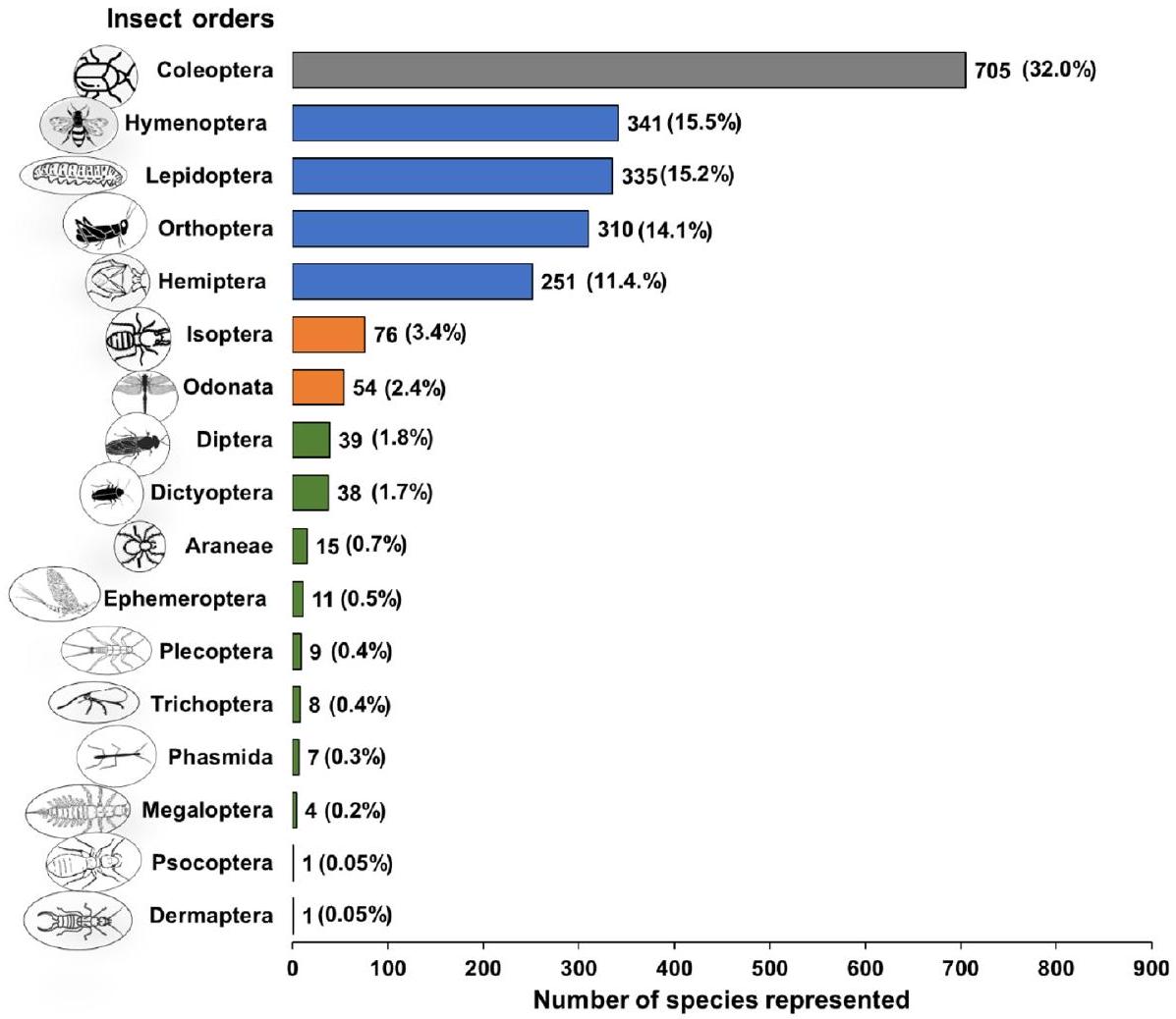 لقد حدد تحقيقنا الشامل 2205 نوعًا من الحشرات، من 25 رتبة متميزة، تم التأكيد على أنها صالحة للأكل (الشكل 1). تختلف هذه الرتب في هيمنتها العالمية بين أنواع الحشرات الصالحة للأكل. تشكل رتبة الخنافس (Coleoptera) الرتبة الأكثر انتشارًا، حيث تشكل