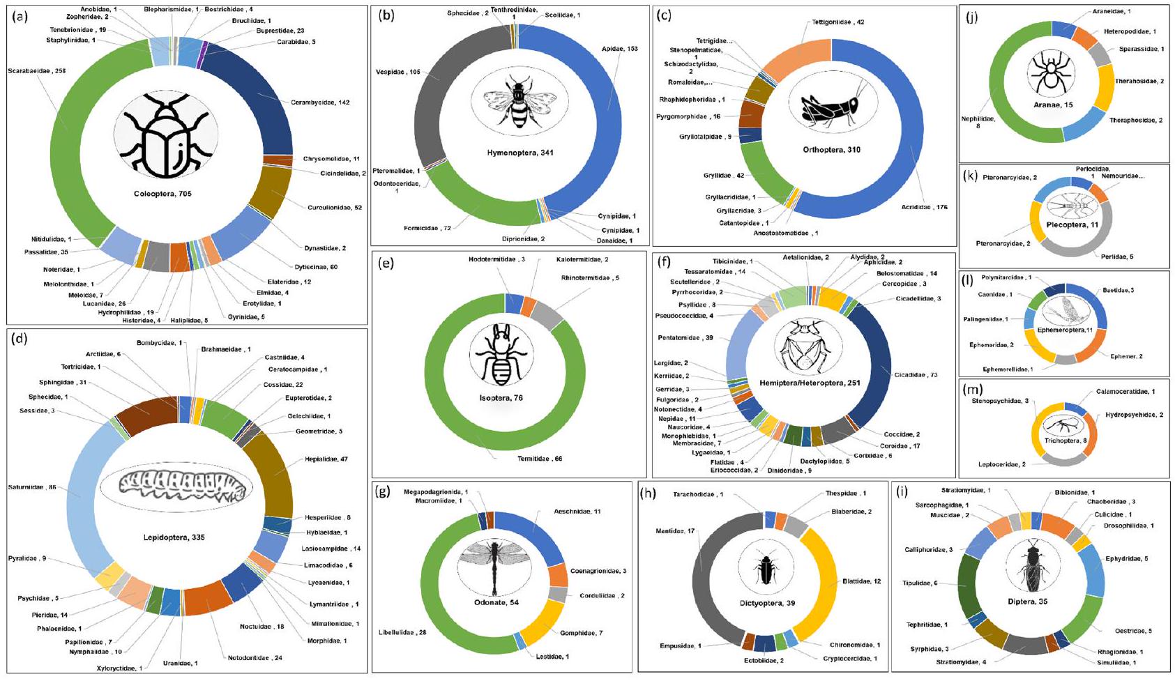 يتم تقديم توزيع أنواع الحشرات الصالحة للأكل، عبر الطلبات والعائلات، في الشكل 2، مما يكشف عن رؤى مثيرة حول تنوع الاستهلاك. ضمن طلبات الخنافس، تبرز تسع عائلات بارزة، تحتوي كل منها على أكثر من 10 أنواع: Scarabaeidae، Cerambycidae، Dytiscinae، Curculionidae، Passalidae، Lucanidae.