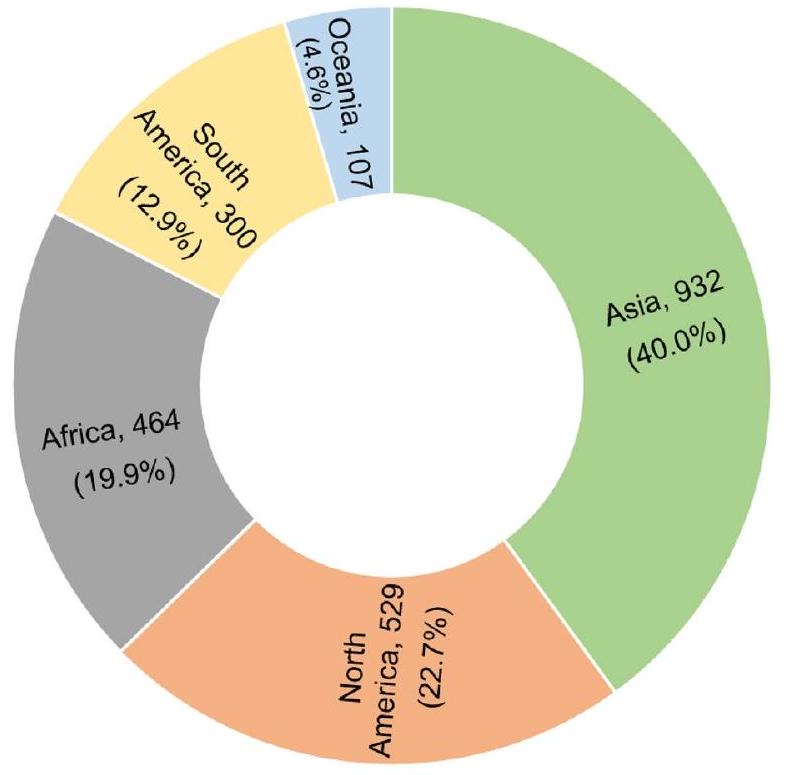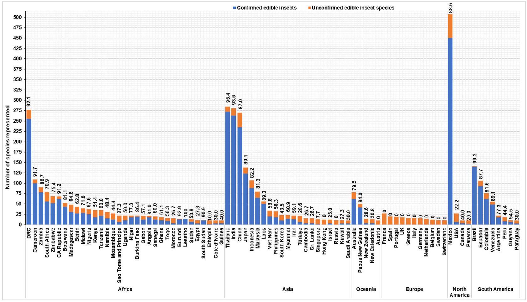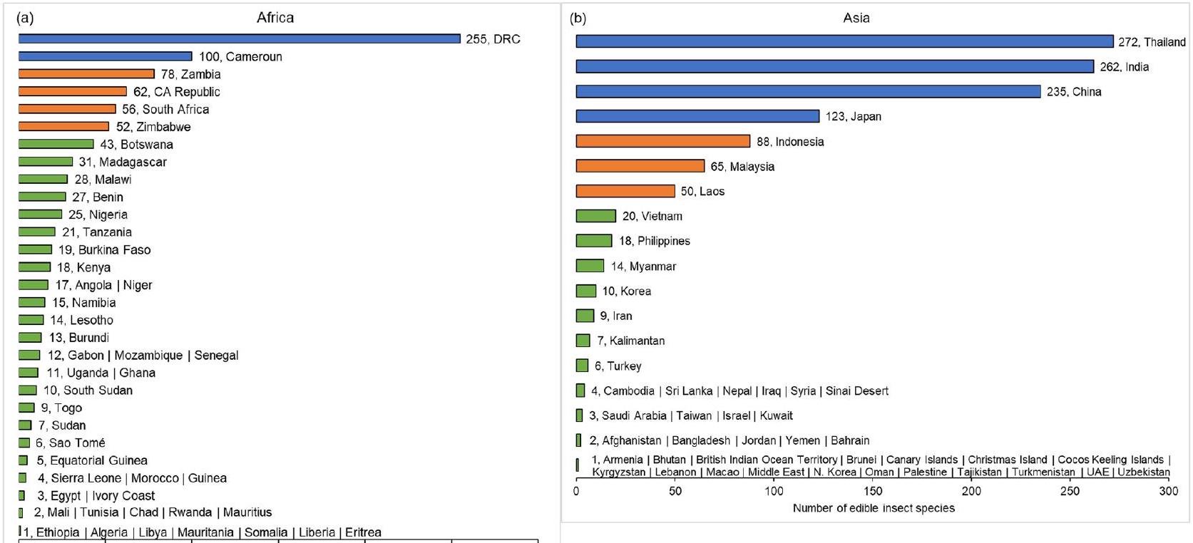 تحتوي آسيا على أكبر عدد من أنواع الحشرات الصالحة للأكل (932)، تليها أمريكا الشمالية (بما في ذلك المكسيك) (529)، وأفريقيا (464)، وأمريكا الجنوبية (300). في المقابل، تحتوي أوقيانوسيا على أقل عدد من الحشرات الصالحة للأكل (107) (الشكل 3).