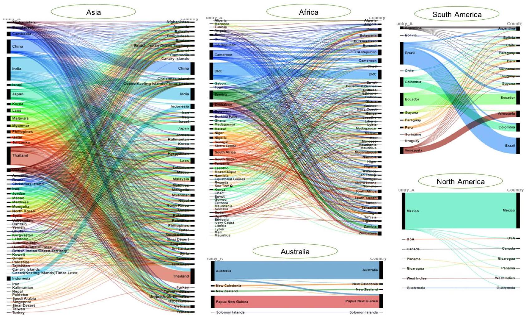توضح الأشكال النسبية لأنواع الحشرات القابلة للأكل المشتركة بين الدول داخل كل قارة في الشكل 6. ومن الجدير بالذكر أن العديد من أنواع الحشرات مشتركة بين الدول في آسيا وأفريقيا وأمريكا الجنوبية، مما يعكس الممارسات الغذائية الشائعة والتفضيلات الإقليمية.