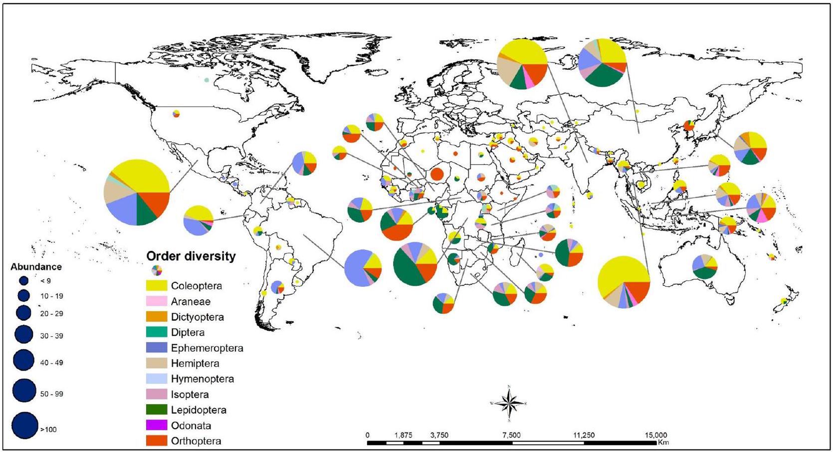الشكل 1. التوزيع العالمي لأنواع الحشرات الصالحة للأكل حسب الرتبة التصنيفية. اللون الرمادي يمثل