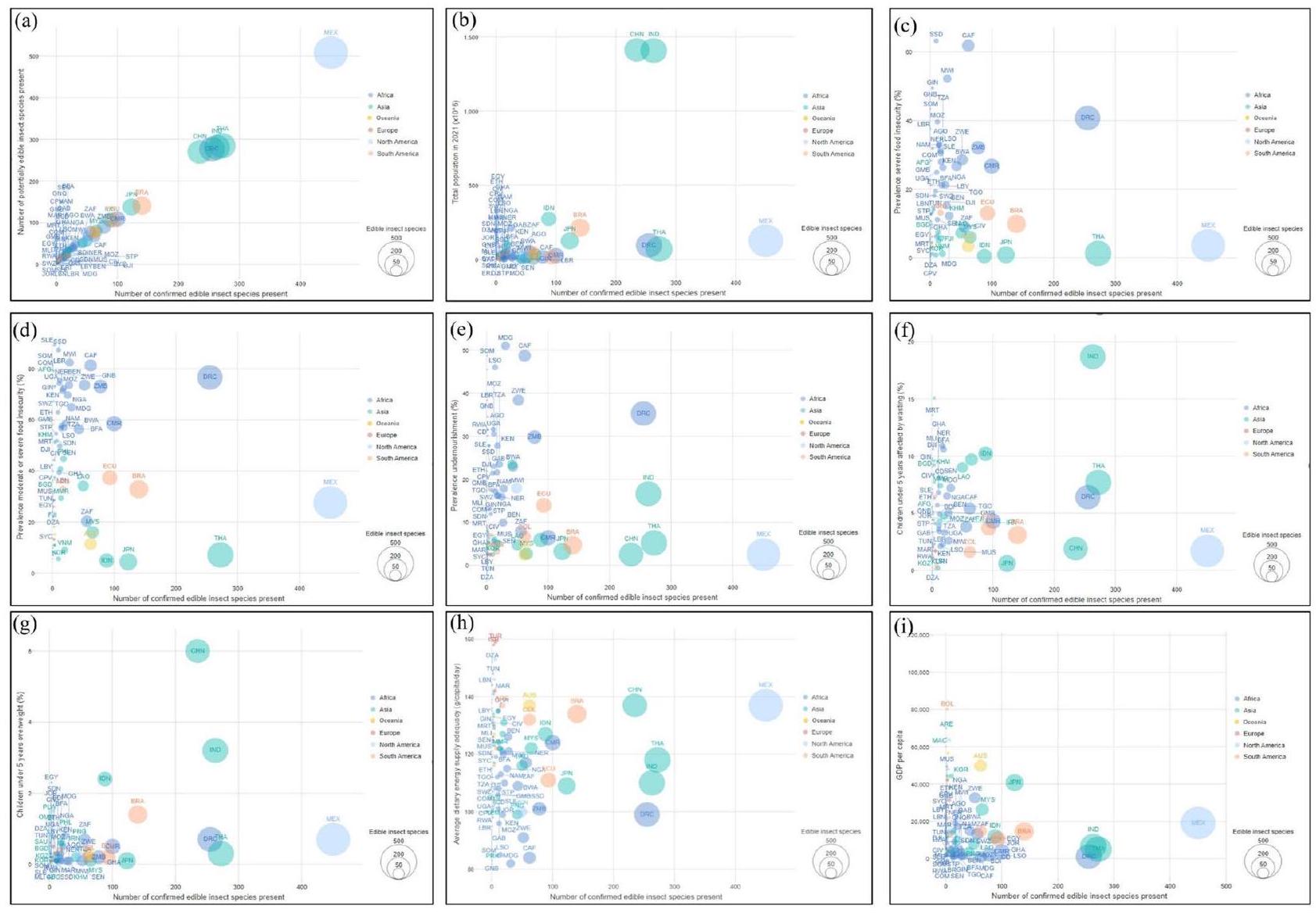 Countries with a higher average dietary energy supply adequacy, e.g., Türkiye, Israel, Tunisia, and Lebanon, consume few edible insect species. Countries with the most edible insect species have relatively good dietary energy supply adequacy, e.g., Mexico, Thailand, India, the DRC, and China. This finding is debatable and demonstrates the point that the eating of insects is unrelated to archaism and lack of civilisation. Economically advanced countries could still practise cultural heritage, such as insect consumption, while developing modern technologies for edible insect mass rearing and advanced processing. Countries with the highest revenues per capita, e.g., Bolivia, the United Arab Emirates, Macao SAR, Mauritius, and Korea, consume fewer insects, whereas countries with the lowest revenues consume more insects. The lack of consumption could be attributable to low diversity and the absence of insect-eating habits or culture. However, countries such as Japan and Australia, with a relatively high GDP per capita, consume many edible insects. Edible insects are viewed as providing a new source of protein, not necessarily for energy. However, in countries where people are suffering from underproduction of calorie-rich foods (e.g., staples and edible insects), the livelihood opportunities could be balanced with agricultural productivity. Our study shows that insects are a valuable food source for both lowincome and high-income countries, across the globe. Given favourable climate conditions and vegetation, edible insects could be traded from low-income to non-consuming countries in an improved and sustainable food system and economic value chain.