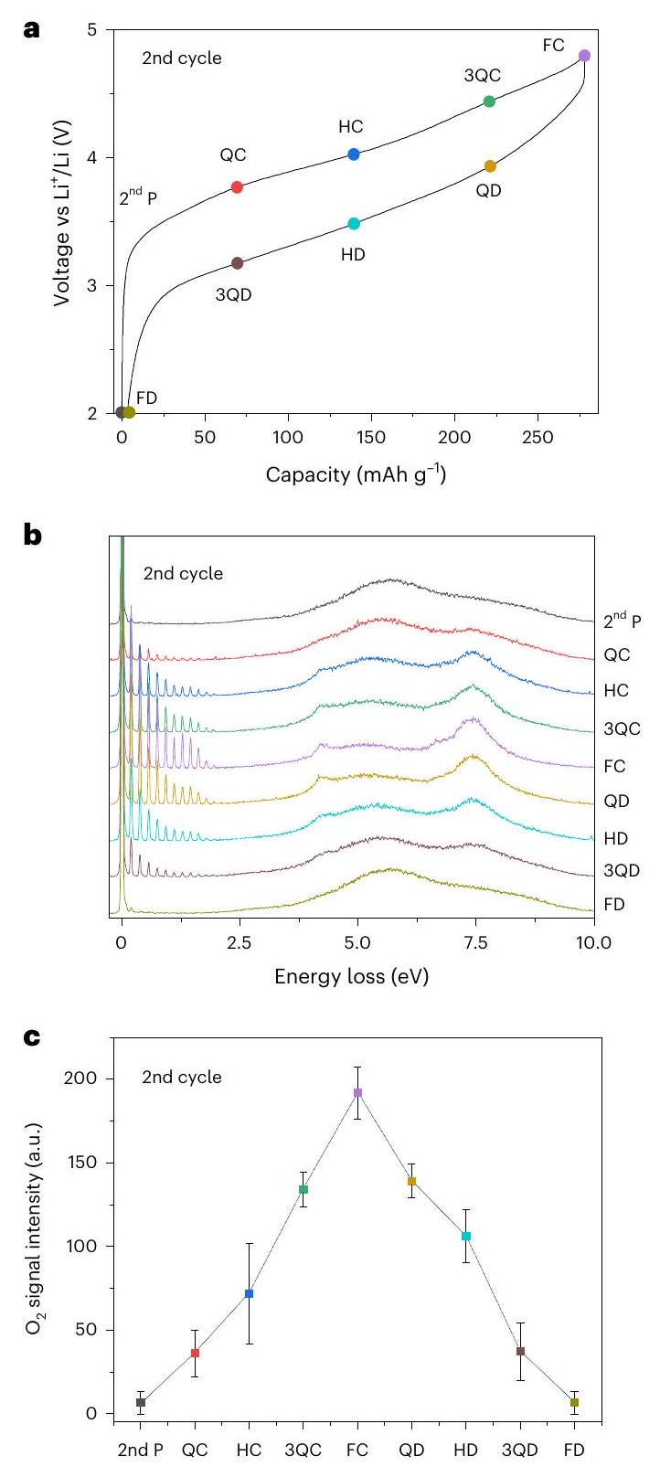 نهاية إشارات التفريغ تشير إلى أن المحتجزيصبح غير نشط كهربائيًا بشكل متزايد. أخذ الفرق بين الـفي نهاية الشحن والتفريغ يكشف أن كمية سعة الأكسدة والاختزال تتناقص منلكل وحدة صيغة في الدورة الثانية إلىلكل وحدة صيغة في الدورة المئوية. كنسبة مئوية من إجمالي الشحنة المارة، يتناقص O-redox منفي الدورة الثانية إلىفي الدورة المئوية، يتم تعويض توازن السعة بواسطة TM redox. تنشأ خسارة سعة O-redox أثناء الدورة جزئيًا من تكوين مواد غير نشطة كيميائيًا.الذي لا يزال محاصرًا ولكن لا يمكن تقليله في كل دورة، ولكن أيضًا من الخسارة الإجمالية لـمن الجسيمات، المنعكسة فيفقدان في نهاية الشحن بعد 100 دورة (الشكل 3). السعة المتبقية النشطة للأكسدة والاختزال في الدورة المئة (يتماشى (لكل وحدة صيغة) مع الشحنة المارة بين FC و HD، أي الشحنة المارة فوق 3 فولت. بشكل عام، فإن فقدان نشاط الأكسدة والاختزال للأكسجين، من خلال مجموعة من العناصر غير النشطة كهربائيًا وإصدار من الجسيمات، يمكن أن تفسر