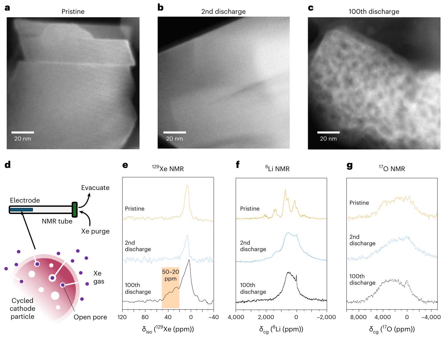 للتحقيق في مدى إغلاق أو فتح الفراغات،تم استخدام الرنين المغناطيسي النووي للزينون. زينون-129 ( ) هو غاز خامل ذو سحابة إلكترونية قطبية كبيرة، مما يمنح الزينون نطاق تحولات كيميائية واسع.. عندما يكون مقيدًا داخل فراغ، ويتلامس مع سطح الفراغ مما يتسبب في تشويه سحابة الإلكترون وملاحظة تحول كيميائي.. هذه التحول له علاقة معروفة بحجم الفراغ الذي تم تحديده تجريبيًا، كما هو موصوف في الشكل البياني الموسع 6 (المرجع 39).تم تفريغه أولاً تحت فراغ ديناميكي عالي لمدة 48 ساعة لتفريغ العينة، قبل أن يتم تدفقها بغاز الزينون (الشكل 4d). تظهر طيف الزينون لعينات المادة الأصلية، والمادة بعد التفريغ الثاني والمادة بعد التفريغ المئة في الشكل 4e جميعها ذبذبات مركزة عند، متسق مع توسيع الغاز الزينون الكثيف مغناطيسياً بسبب التفاعلات مع سطح مادة الكاثود. قد تنشأ الإشارة من كميات كبيرة ( ) فتح المسام على السطح، على الرغم من عدم وجود مثل هذه المسام في ADF-STEM. بعد 100 دورة، لوحظ زيادة في الكثافة الطيفية بين 20 جزء في المليون و 50 جزء في المليون في طيف NMR للزينون. هذه الإشارة غير موجودة في المادة الأصلية أو المادة التي تم تدويرها للمرة الثانية، مما يعني أن فراغات جديدة مفتوحة بحجم لا يقل عن 17 نانومتر تتشكل (الشكل 4e). هذه الإشارة الجديدة لن تظهر إذاقد فقدت مباشرة من السطح، فقط ذرات Xe في مسام جزئية محصورة مفتوحة على السطح تختبر تحولًا كيميائيًا، وبالتالي يجب أن يكون هناك زيادة في مسامية السطح. تدعم هذه الملاحظات باستخدام الرنين المغناطيسي النووي قياسات BET التي تظهر أيضًا زيادة في عدد المسام المفتوحة على السطح.في القطر بين الدورة الثانية والمئة (الشكل البياني الممتد 7). الأحجام الأكبر قليلاً من المسام من NMR وBET تتماشى مع بعض المسام التي تم رؤيتها في STEM والتي تكون مترابطة وبالتالي أكبر مما تقترحه صور STEM.