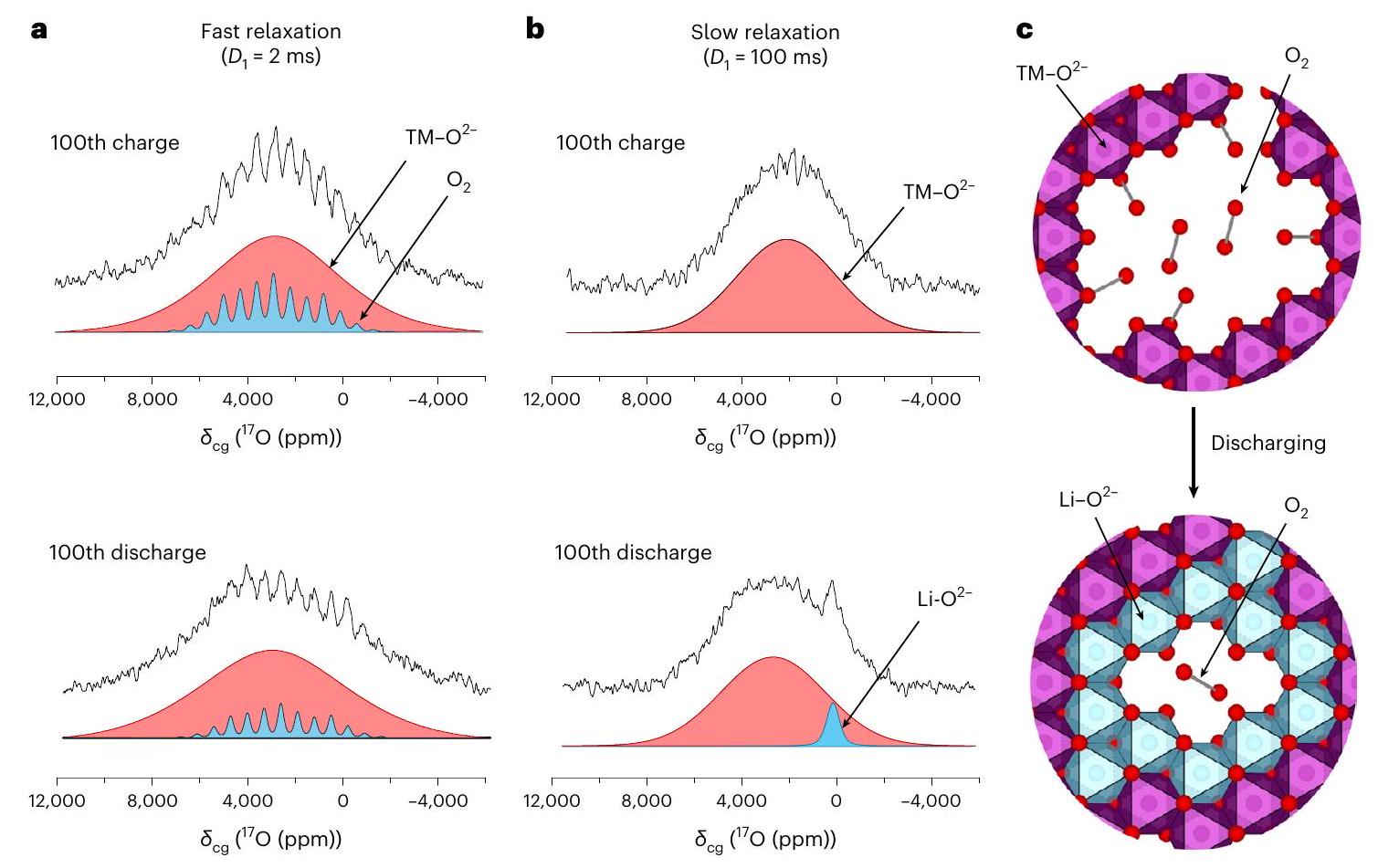Fig. 5 | Partial reduction of trapped in voids to form Li -coordinated on the 100th discharge. a,b, NMR spectra isolating fast (a) and slow (b) relaxing environments. The sharp peaks in are assigned to trapped molecular , which decrease in intensity on discharge. There is still evidence of some residual molecular in the discharged sample, . In the slow relaxation is dominated by oxide environments coordinated to