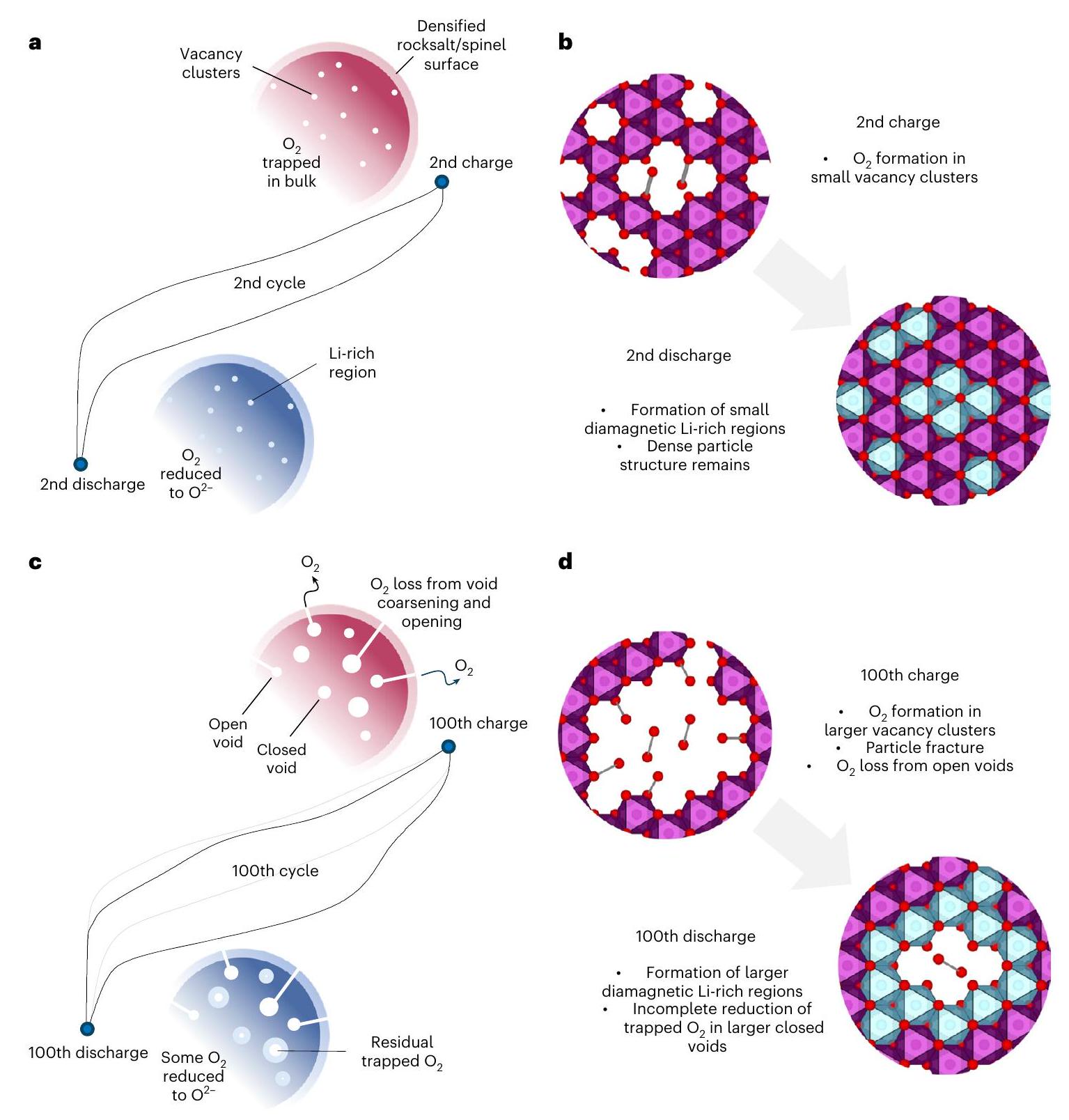 Fig. 6 | Voltage fade mechanism. a,b, Second cycle: reversible O-redox involves the formation of molecular trapped in small vacancy clusters throughout the particle. molecules are fully reduced to on discharge forming small diamagnetic Li-rich regions. c,d, One-hundreth cycle: further TM migration