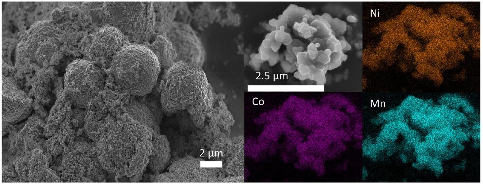 Extended Data Fig. 3 | SEM and EDX for the mixed metal carbonate precursor. Spherical particles of diameter can be seen in the SEM and EDX shows a homogenous distribution of metals within grains and between particles.